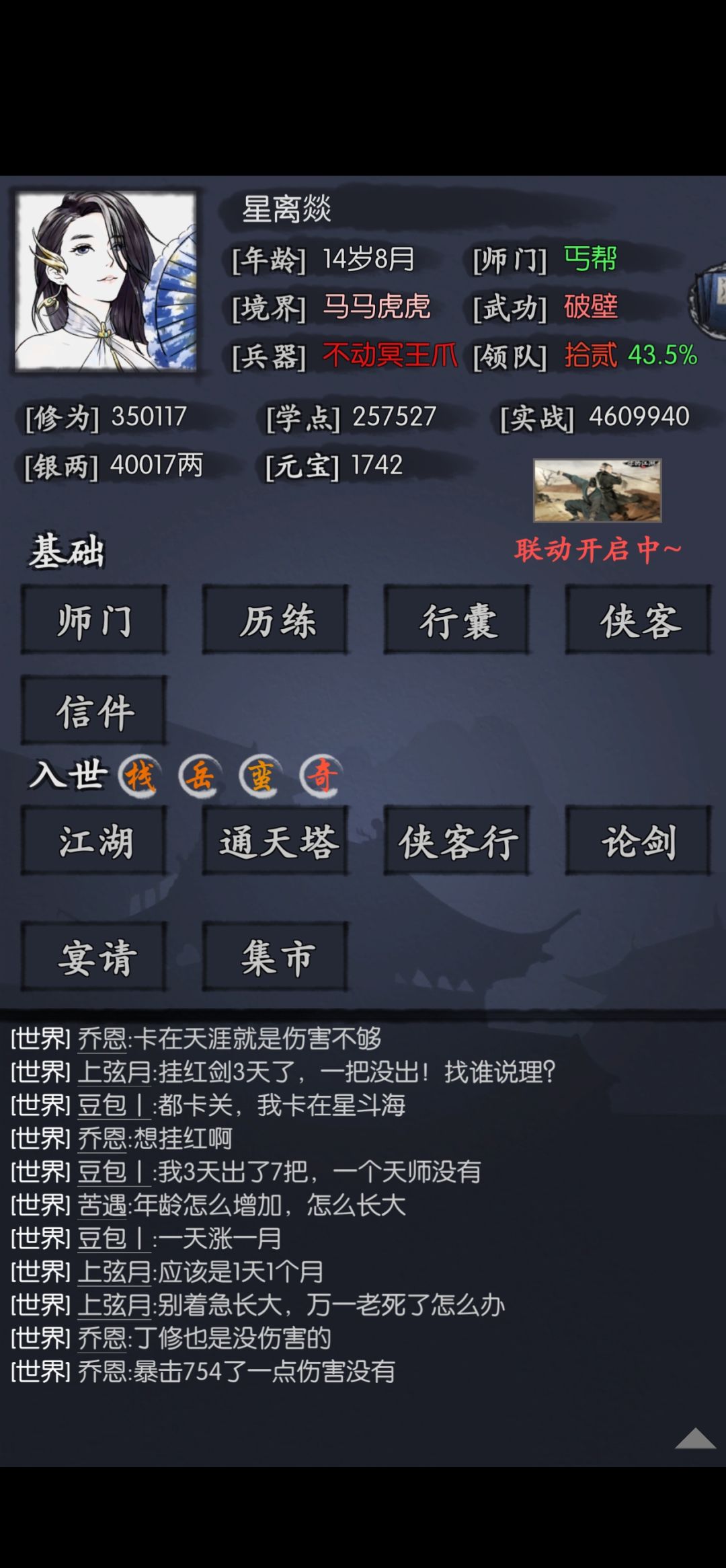开局选择男角色,天赋推荐武学世家(相比其他天赋推图过历练优势极大),需要多开号刷侠客 对话师傅选择刀棍武学,点满刀类武学,装上新手教程里的朴刀历练推到第五关(少林刀推到第五关很容易),解锁江湖。 第二关的免费装备选戒指(暴击对于前期过关很有用),等25点臂力(靠装备词条)解锁箱子拿秘籍。第三关难度稍大如果装备词条太差可能卡关等领三即可不影响。 将武学再次拉满通过合理利用刀棍武学到第历练十一关。领二