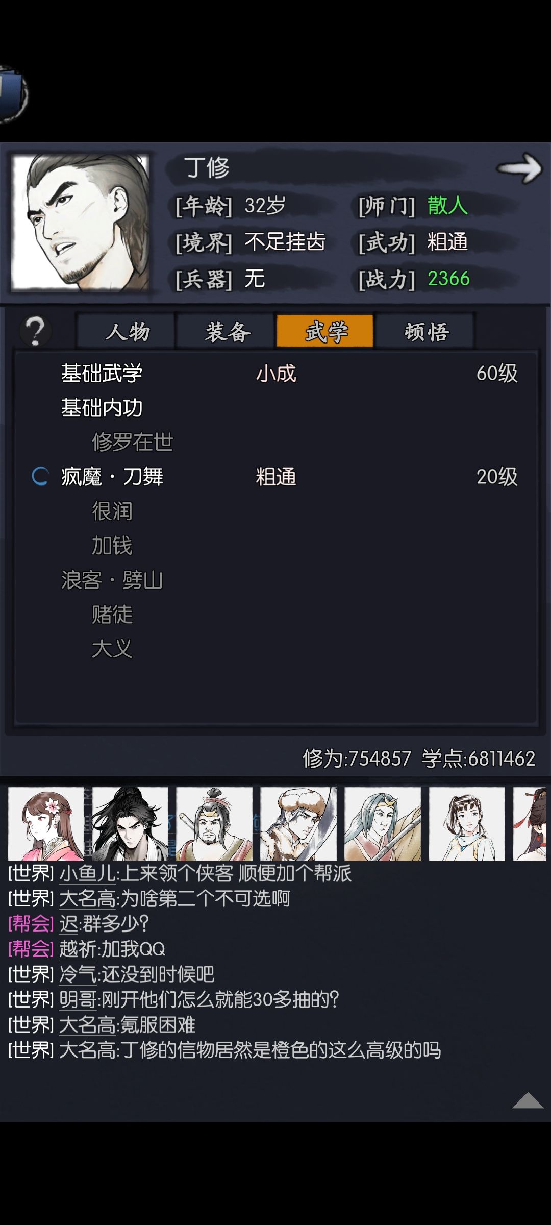 知己任务迟迟未能完成 看来 是时候展现真正的技术了… 东区 云川师太 QBF001064W 1 邵灵儿 万氪以下的第一核心 全程可用 历练稍弱 是平民PVE拿资源 PVP维持游戏信心的基石 不一定第一个开五脉 但一定要是第一个四内满攻 专武最高的侠客 2 胖仔客 开荒阶段可将主从猴棍中解放出来 曾经平民初期最好常规坦 强于胡 因现在新区送萧早而地位下降 但闪避叠加和复活使其在初期侠客行中仍有出场