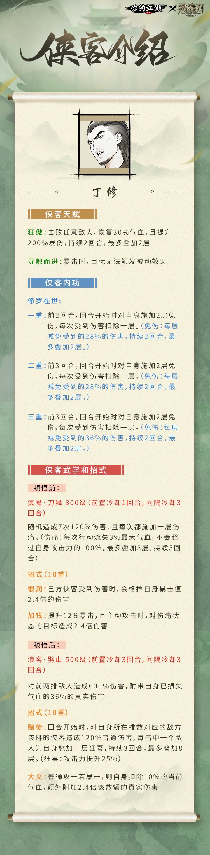 锈刀压孤月。 更那堪、诏狱锁寒,血凝如铁。 曾是皇权掌中刃,惯听漏残更咽。 踏碎长街青霜冽。 谁布暗棋成星罗,困苍鹰、折翼修罗劫。 兄弟血,襟前雪。 [表情_酷] 综评:T1(无迟影降档至T2); 输出A+/B,辅助A,生存A/B,索敌B,启动D; 抽取建议:无迟影抽丁修,有迟影抽沈练。 一、侠客本体解析 1、先看专属。 融四+10属性为:182防、181闪、75%爆伤、62胆识、32定力、30灵