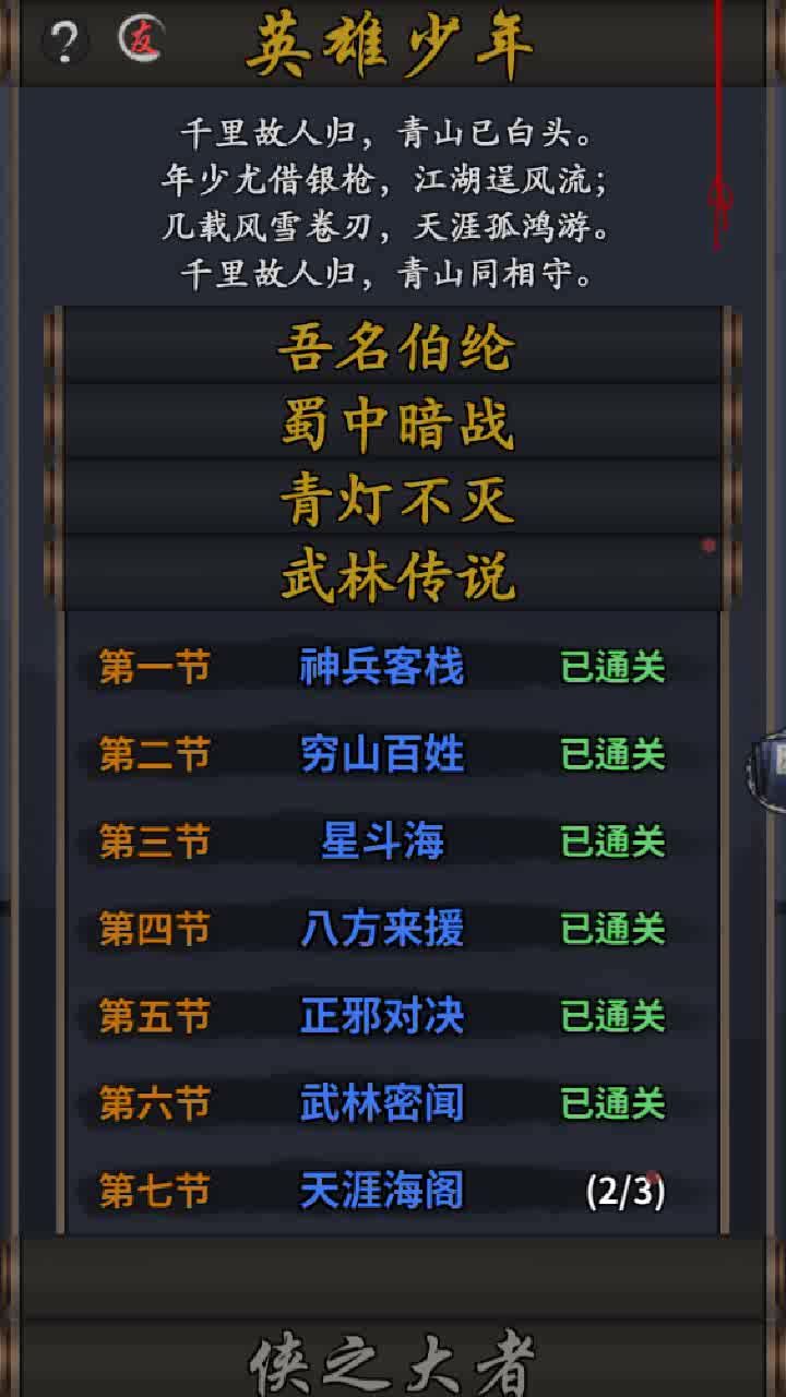 第一次通关时,神秘老者告诉我以后可以去天涯海阁了,每月有三次机会,但是我没找到天涯海阁在哪里啊? 后来我又通关了一遍最后一关,结果神秘老者说了同样的话就再次送我出来了 所以,天涯海阁到底在哪里? 另附最后两关技巧 倒数第二关 说的是每个侠客只能上场一次,其实不是这样的,这句话有歧义,并不是每个侠客只能上场一次,而是只要这个侠客不死,就可以一直上场 所以,这关其实很简单,大概只用到四个侠客就能通关 首