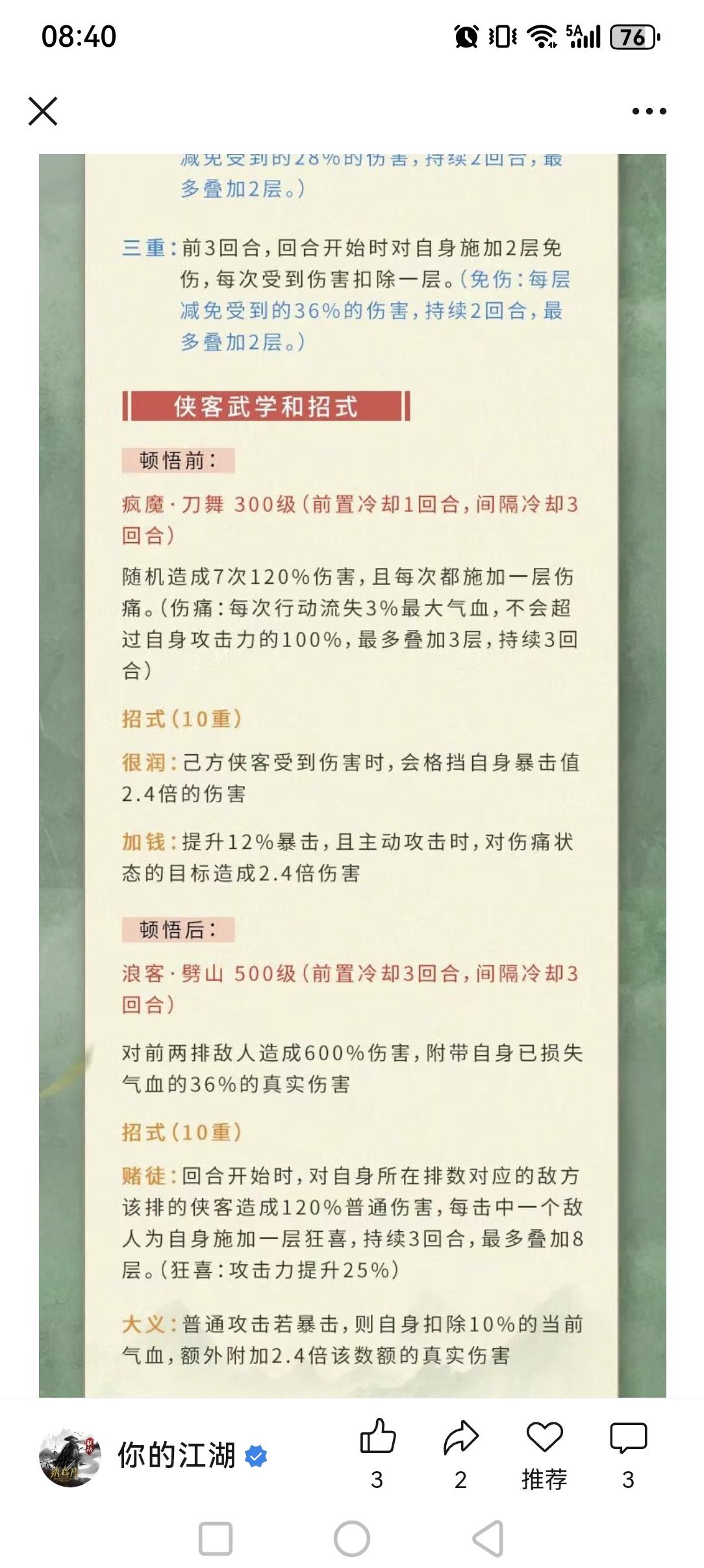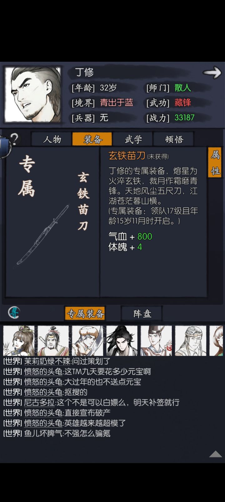 #丁修攻略 天赋分析:回血加爆封,简单粗暴,目前很多的强势武侠就是因为有无冷却的被动,这个封被动非常给力!内功分析:自保内功,很给力,每回合都加免伤,持续三回合基本可以保证三回合不死,除非对面是多重伤害的罗冰或者范渊才能打破,问题是他的天赋又是封被动,很容易就把对面的骆冰和范渊多重伤害的被动给封住!所以内功非常硬,正常的武伤都很难破防。技能1:重点是格挡,这个对多重伤害会有极大的减伤效果