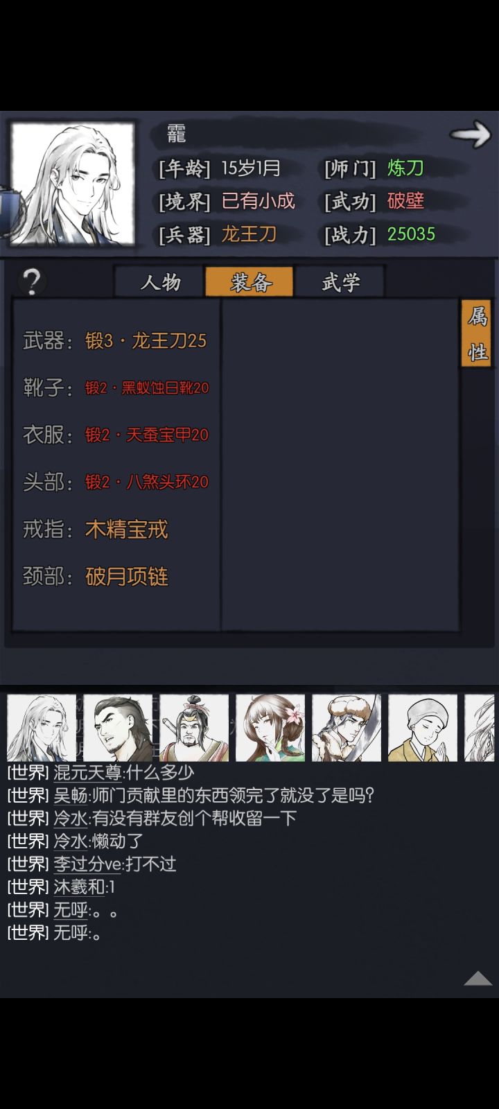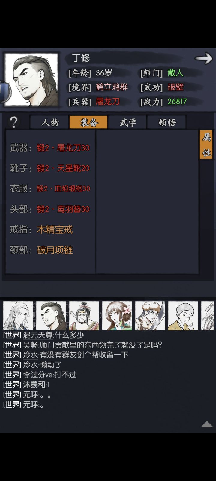 这是我目前两个主c的装备和属性,目前历练卡在八卦宫月,通天卡在37,完全打不过,也扛不住,请问是出什么问题了?目前的阵容是,公孙,主角,肖浩然,小林,和丁修,奶妈海棠和仪摇都有,但是不知道怎么配队比较好,有没有大佬的阵容站位配队,以及装备可以参考