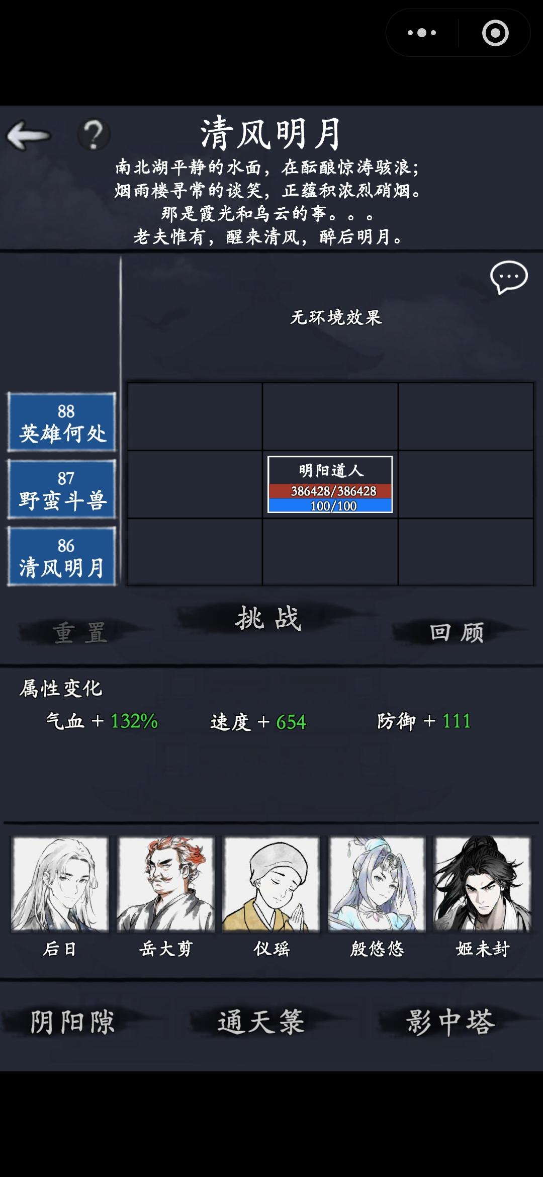 #迟影攻略 小氪堆肉就行让本体多放两个陷阱就成功了。拉满二技能,一技能点亮,三脉,一内就能玩,大概要160+15+35+24=234个信物。再往上五脉、专属融三、二内、三内量力而行吧。装备内气也是往肉上靠,五尊/不动+喜怒+金蝉+鸟头+镇魂+上古,木橙三合转尘黄地。感觉这个侠客出来,还是在针对过于猖狂的姬哥:减攻光环减棍队反击伤害,2技能陷阱爆炸本体不吃棍队反击,2-1、2-2降低棍队肉度辅助