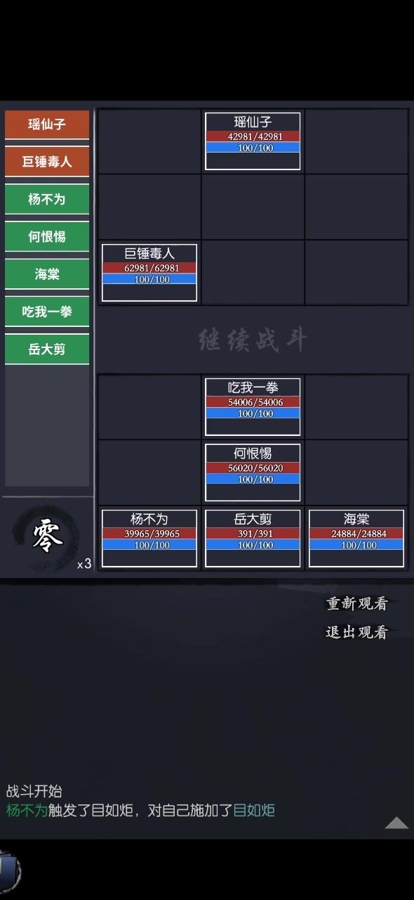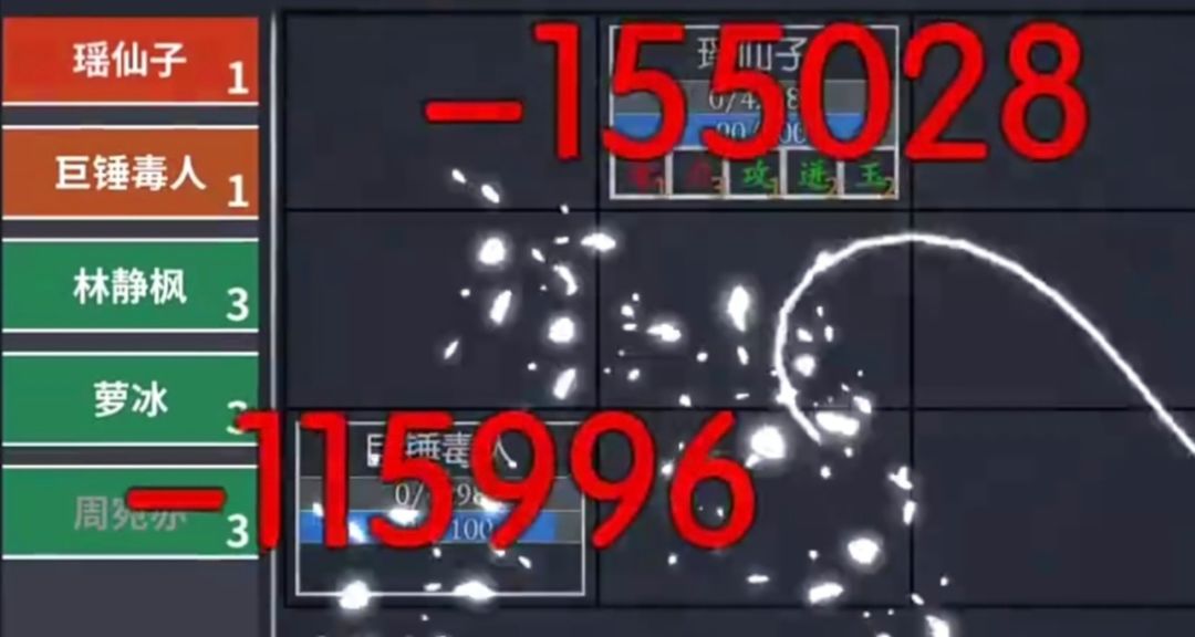 有小偷周姐完全用不了,忽然想起来玩小林的时候是怎么一拳一拳捶死瑶仙子啦! 先把碍事的捶死不就好了嘛! 吃我一二三四五六七八拳!! 要点: ①爆免450%红字是1,主武免越高越好 ②何姐叛邪规避巨锤毒人毒液的回合外伤害 ③何姐多穿点血,少点爆免,伤害控制在两拳打完毒人儿,给素素长生诀和药王的空间。 ④毒人死掉以后何姐再挨一下就可以死了,剩下交给主杨 ⑤过儿一二技都行,何姐死的慢就给过儿带1技,帮瑶仙