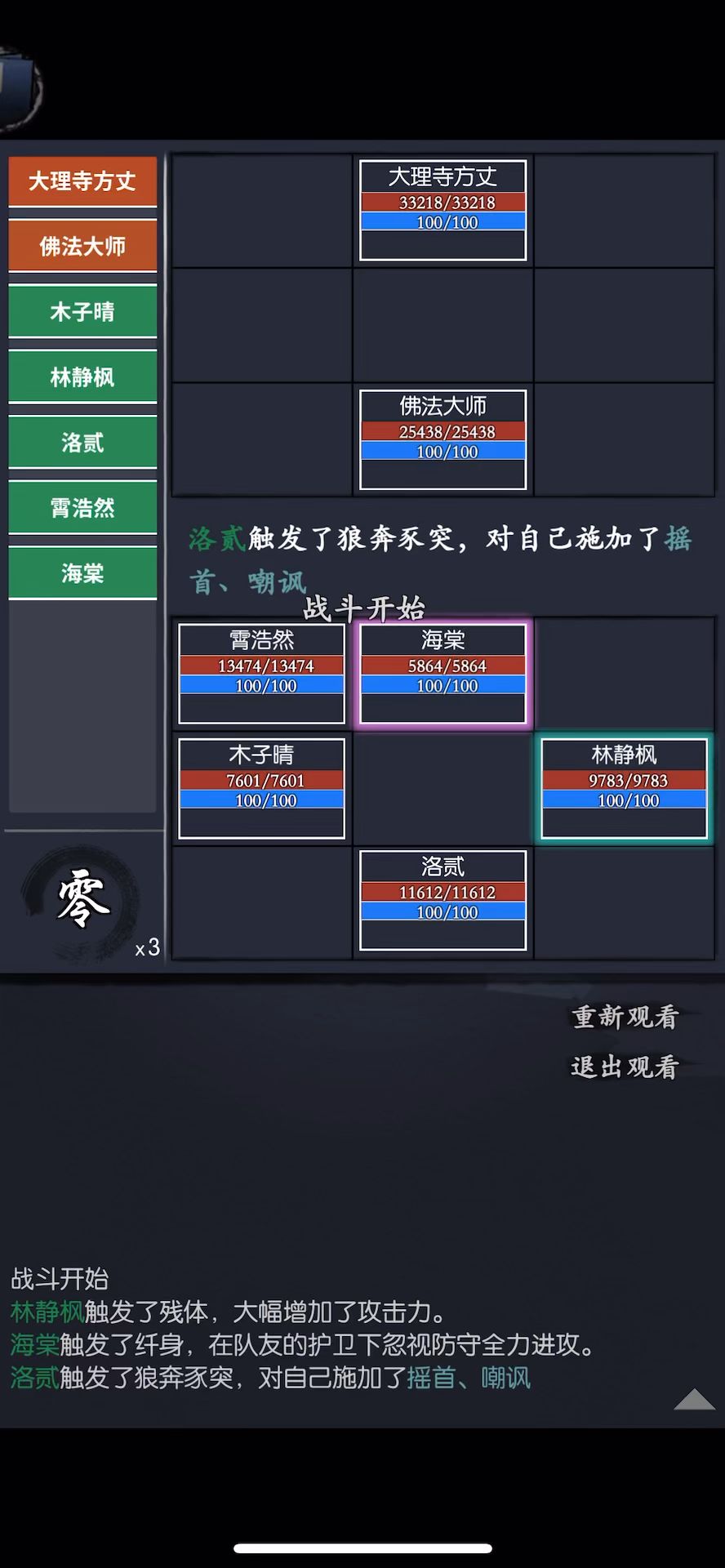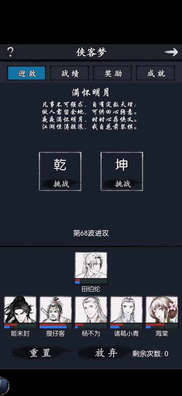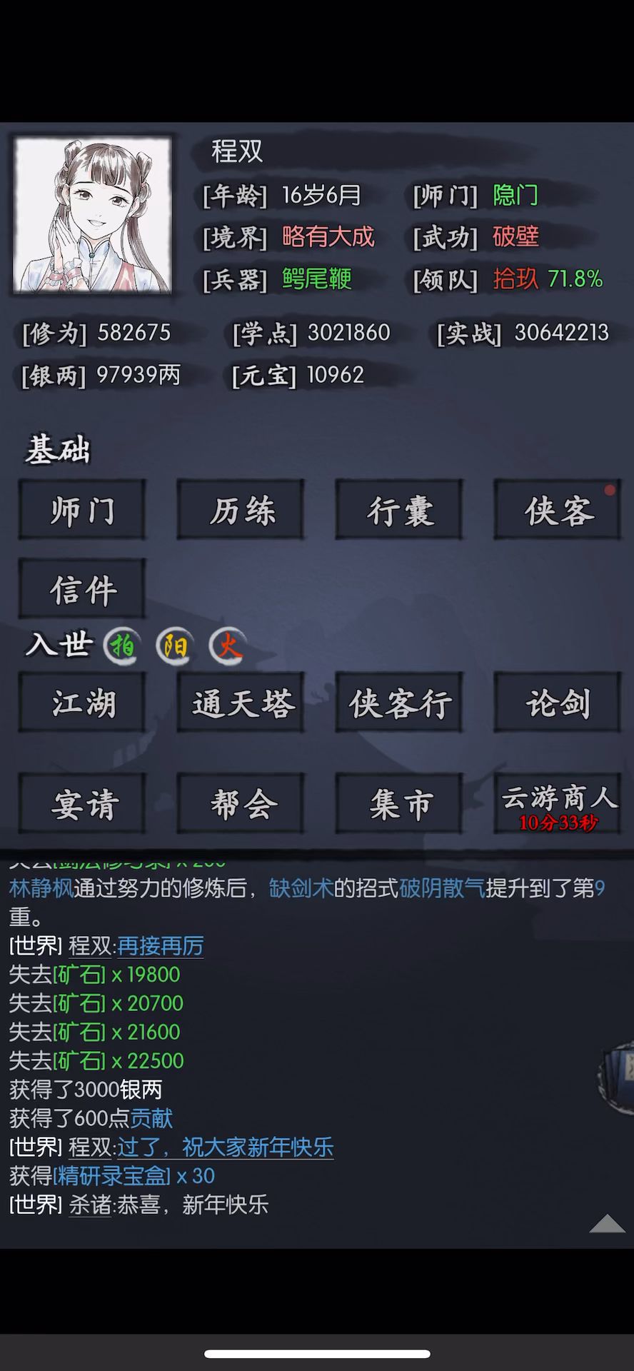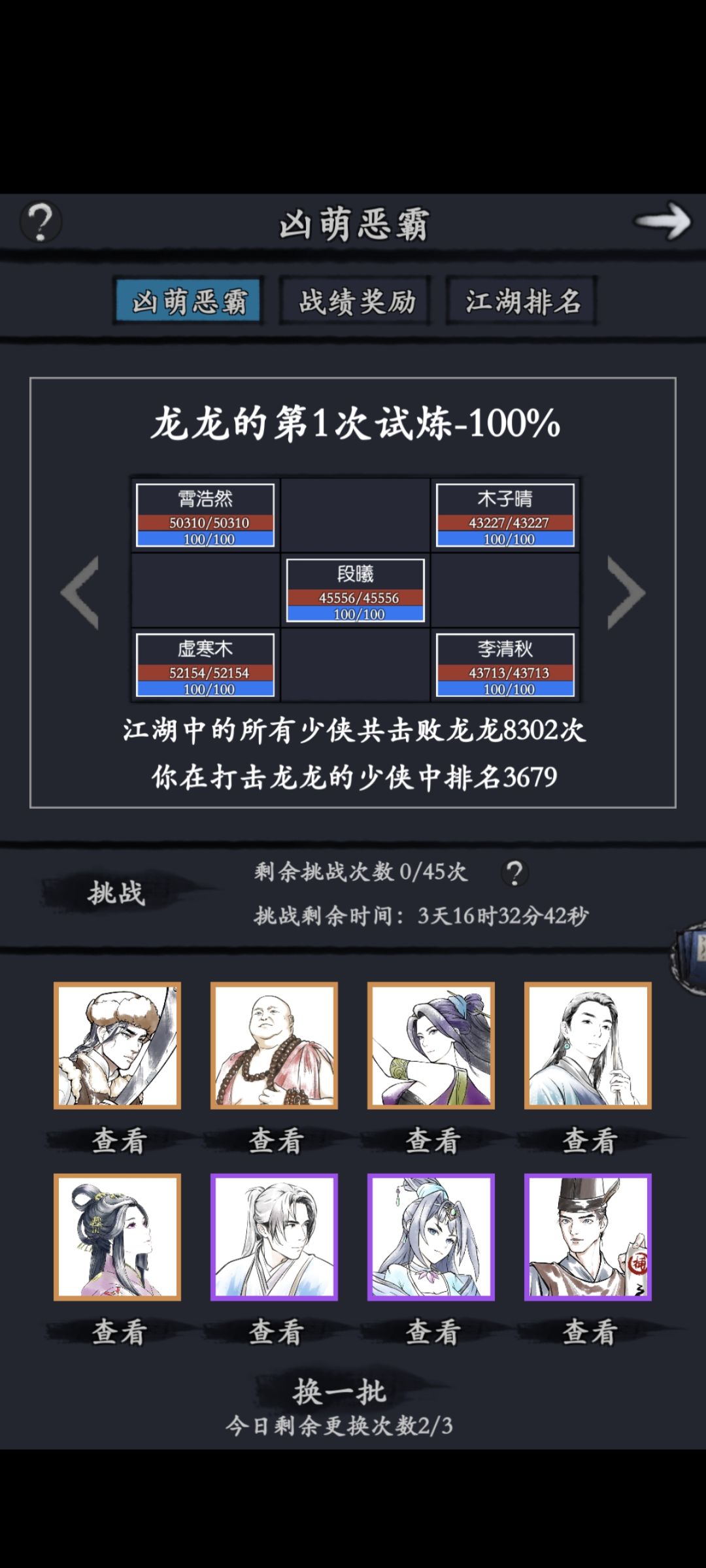 各位侠友,新年快乐。 借我们兰城杀诸兄弟的吉言,新年新气象,侠客行给了个无想、松竹和巧天,还给了天蚕和金蝉,运气爆棚。 张三卡了好几天,也是过了,特别感谢大师姐洛衣,其他的速度啥的大家都知道,我打的应该次数不算多,要点就是尽量压武学加爆伤,我压的至少挂个日或者给张三月才能秒掉,尽量少打回合。 再一个,大师姐摸索的,我觉得很有用,点战斗按钮,延迟的才可能过,我也是调整好了装备之后,卡顿的三四次就过了