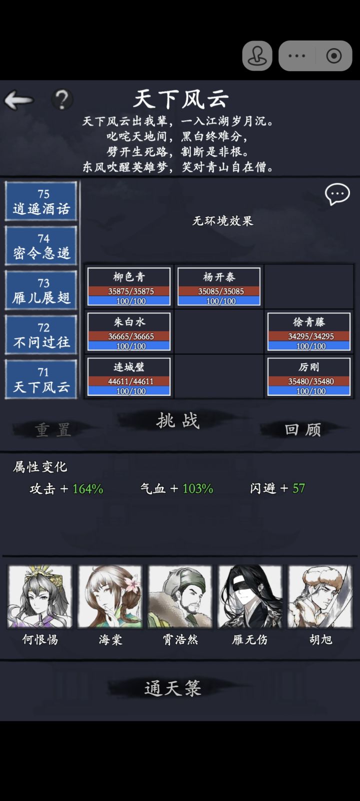 拿胜邪之前小林用爆伤绿剑。现在有1技雁,用他1技能武学给小林加暴击爆伤剪死→1技雁武学→1技萝武学→小林平a猴棍主,林,萝,雁,海,杨,剪,根据对面站位,谁行上谁。除了送死的剪和林有固定装备,其余人保证基础爆免发挥自己的作用为准。海第一天1-2无脑升到9,1-1慢慢升主的面板爆免尽量多,这样才有机会项链才有机会换圣月撑武免来提高第三回合武学回合的坦度。主躲过儿身后的时候,俩人血量可以相近一起吃药王,前提是过儿有基本的爆免来吃鞭的红字没掉大血