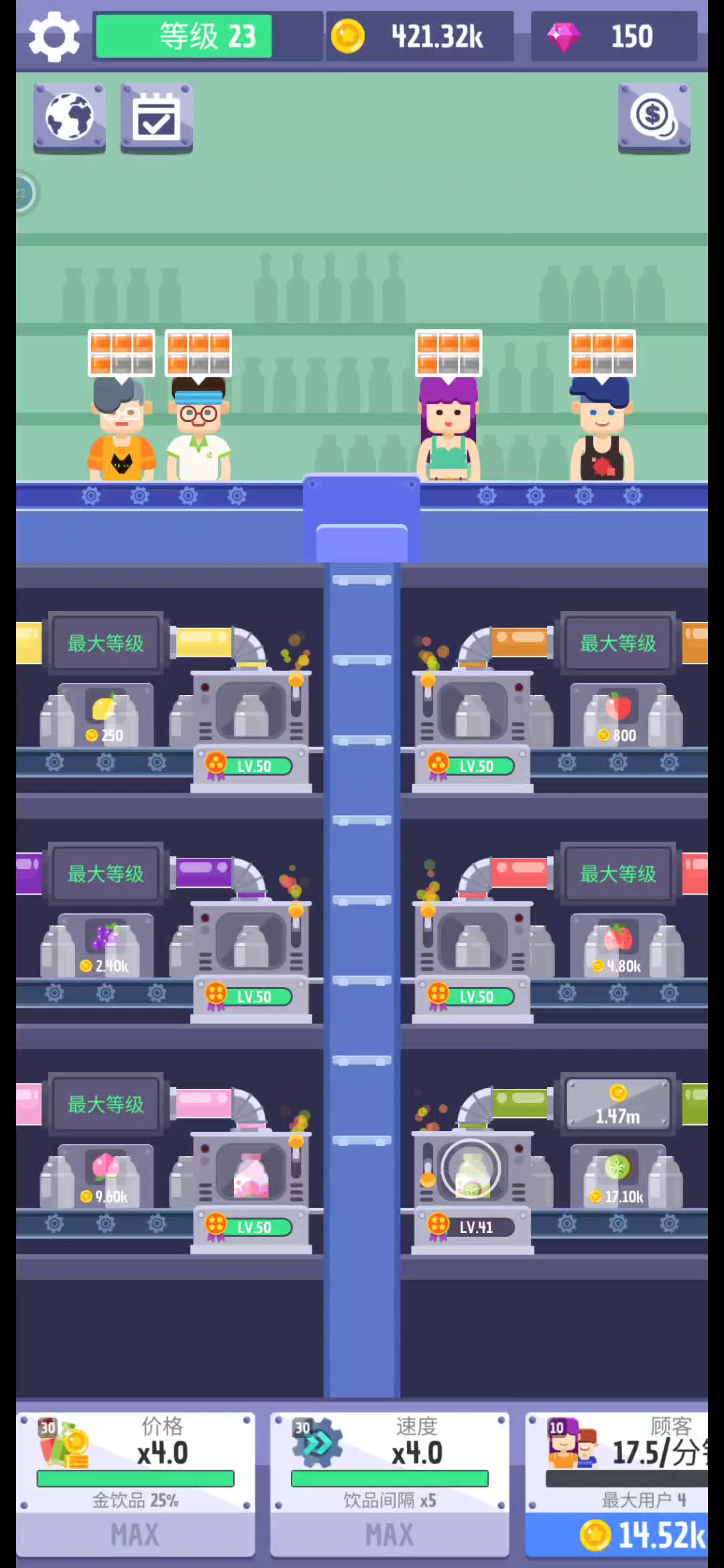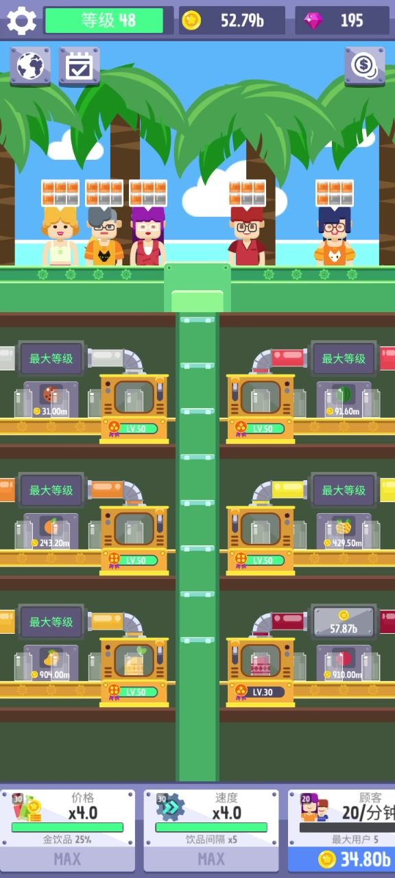 我把底下中间的速度升到满级,最底下两种饮料机罢工,从而导致全线停产,最终游戏进行不下去,望修复。