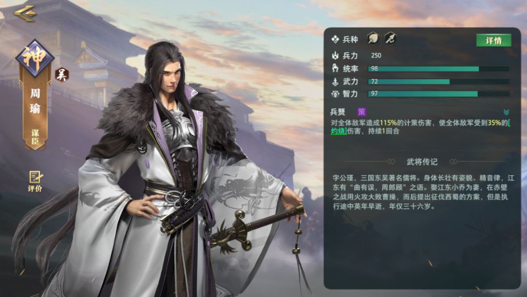 小伙伴们千呼万唤的吴国大都督——周瑜,目前正上架活动八卦秘宝(温馨提示:此活动是限时的,过了就没有了哦),小伙伴们可以通过转盘抽取周瑜碎片来合成和升星武将周瑜。 在三国题材的游戏中,大都督周瑜都是那个集美貌与实力并存的武将,本篇攻略就来给大家详细介绍周瑜的定位和阵容搭配。 武将定位 定位 周瑜在《卧龙吟2》中属于群攻计策输出武将,同时基础智力和统率属性非常优秀。 首先来看一下周瑜的技能介绍:兵燹,