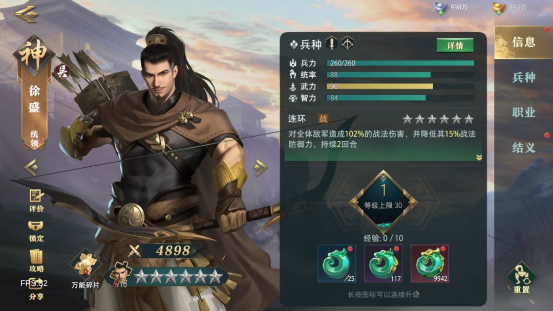 徐盛是三国时期吴国著名武将,他的骁勇善战甚至让魏国都退让三分。在《卧龙吟2》中,徐盛的实战能力也是非常强悍,这也让许多对手表示头疼。 那么,徐盛要怎么玩,如何选择与之搭配的武将,下面我们就来详细了解一下吧! 武将介绍 徐 盛 ★ 品质:神将★ 国家:吴国 ★ 技能属性:战法 ★ 职业兵种:统领——步兵、弓兵 ★ 武将获取:聚贤馆常规卡池招募、王佐之资卡池招募 面板分析 徐盛虽然技能的伤害没有那