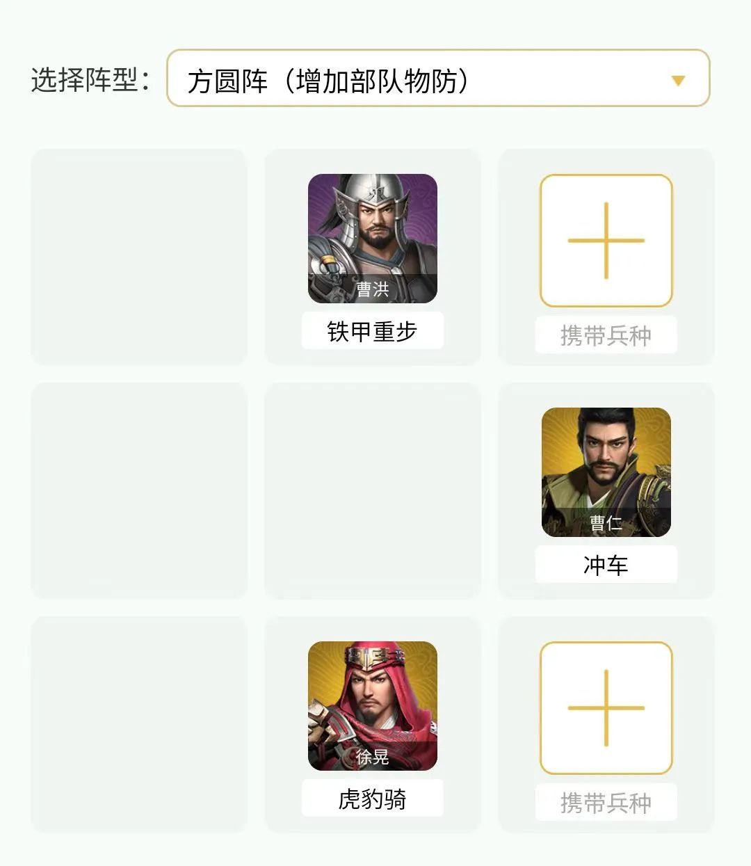 随着主线的进程,本期为各位主公带来演义模式曹仁传1-10关的通关阵容攻略,受暴击、概率命中技能的影响,如果遇到阵容通过失败的情况,就多试几次就有几率通过哦。 江陵防御战(一) 武将兵种搭配曹仁(冲车),徐晃(虎豹骑),曹洪(铁甲重步) 采用阵型 武将站位 江陵防御战(二) 武将兵种搭配曹仁(冲车),曹洪(虎豹骑),徐晃(虎豹骑) 采用阵型 武将站位 据守樊城(一) 武将兵种搭配曹仁(老练刀兵) 采