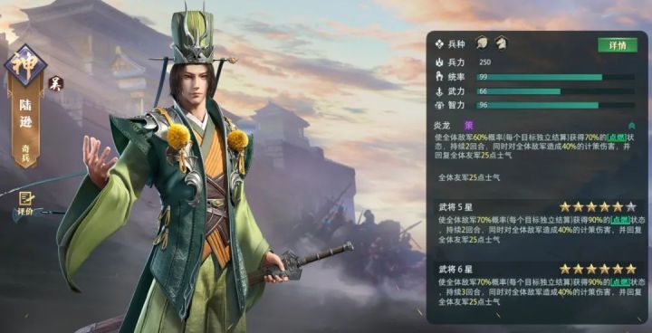 陆逊,三国时期吴国的著名将领。陆逊跟随孙权四十余年,统领吴国军政二十余年。其为人深谋远虑,忠诚耿直。一生出将入相,被赞为”社稷之臣“。在《卧龙吟2》中,陆逊是一位非常强力的策攻类武将,尤其是在与周瑜等计策武将配合的情况下,其杀伤力巨大,打出的输出相当可观。 武将介绍陆 逊 ★ 品质:神将★ 国家:吴国★ 技能属性:计策★ 职业兵种:骑兵——文官、骑兵★ 武将获取:出将入相卡池、聚贤馆