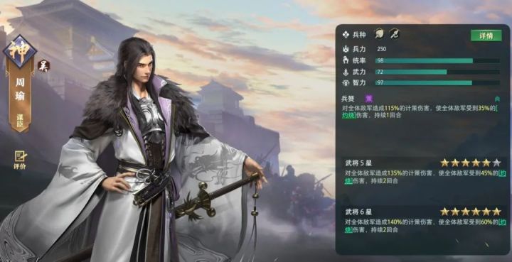 小伙伴们千呼万唤的吴国大都督——周瑜,目前正上架活动八卦秘宝(温馨提示:此活动是限时的,过了就没有了哦),小伙伴们可以通过转盘抽取周瑜碎片来合成和升星武将周瑜。在三国题材的游戏中,大都督周瑜都是那个集美貌与实力并存的武将,本篇攻略就来给大家详细介绍周瑜的定位和阵容搭配。武将定位定位周瑜在《卧龙吟2》中属于群攻计策输出武将,同时基础智力和统率属性非常优秀。首先来看一下周瑜的技能介绍:兵燹,