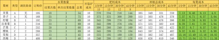 下图包含所有两个果子的配方和三个果子的配方(只含3个重复果和3个不重复果)。 以下六张图是以施第二快的肥为基准(施别的肥都没这么划得来),同时以开三块地为前提的数据计算。第一个利润是一瓶果汁售价的利润,第二个30分钟利润是以三块地30分钟种两茬,两个果子两茬出9瓶,三个果子两茬出6瓶为基础。 前面两张图是两个果子的配方和利润。后面四张图是三个果子的利润和配方。 总结数据,利润前三排序:一口梅