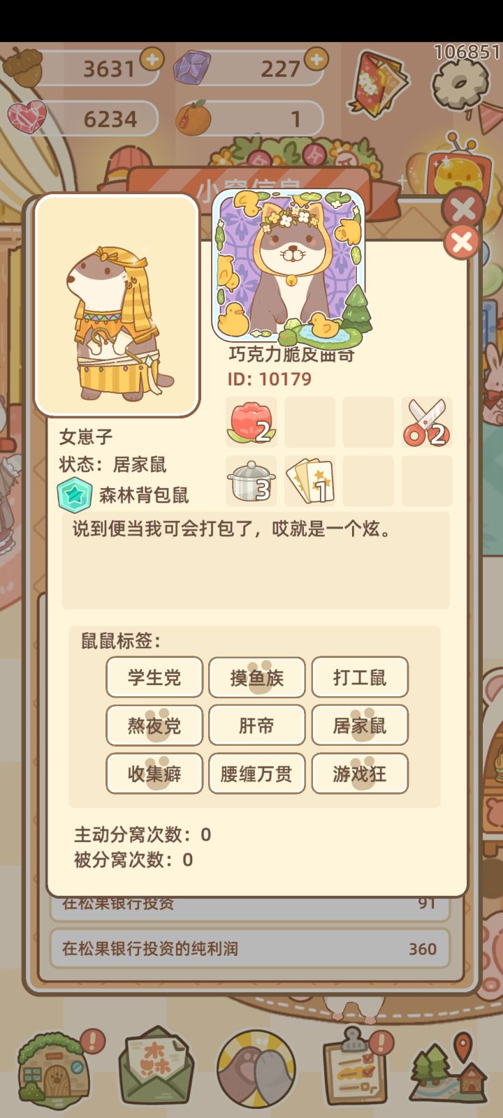 如题,新手时期和ai打工鼠组窝,但因为千辛万苦搞了一天,我赚一千他是零而分窝,灵魂匹配了个打工鼠后爱心值到6k左右对方7天不上线,第八天申请分窝。痛定思痛,在用一天平复心情之后,我申请了个ai居家鼠,而我变成了打工鼠。芜湖,快乐,让我康康打工鼠的暴富之路。把对方的能力点起来均为1级后,反正上线就有10+的食物,5+的花束,打工要买便当怎么了,就当是成本了,我当居家鼠的时候对方天天催我做便当做