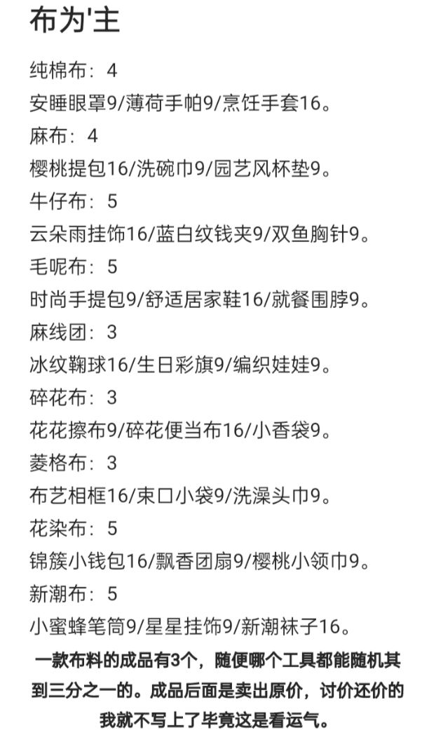 这是目前可制作的成品图纸布后面数字是布的价格,工具这个你们随便买也可以买便宜的,它这个是在布的3个成品里面随机其中一个,也是说是出隐藏款成品价格是16。如:碎花布3松果+价格1松果工具随机可以制作出16松果成品物品。如:牛仔布5松果+价格1松果或4松果工具也能出16松果成品物品。如有记录错误上来报告。ID10179居家鼠先做主线,勋章都在主线里面,把勋章拿到在刷拿到的勋章内容去制作刷量,