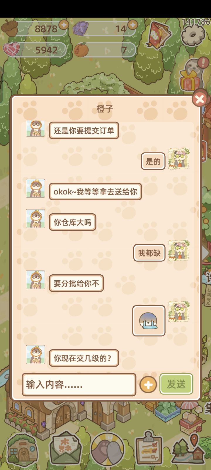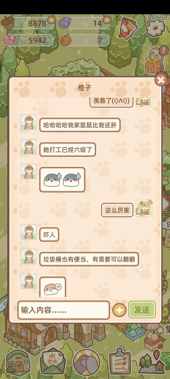 #鼹鼠同行之森林之家 #游戏日常 没想到,这种事情还能发生在我身上。事情起因,我一开始就照常的点开了(因为我不喜欢有红点点),然后我看见了Ta拜访留下了食物。之后,我就点开好友找Ta,并感谢了Ta。 后面,就和Ta聊了一会,两人都很肝,好羡慕!因为我家鼠鼠是我dx,他不熬夜,每天我都要轰炸他几次,不然他就不做了。10点后他就睡觉了,我也只能干其他事情。 现在,我就不用担心了