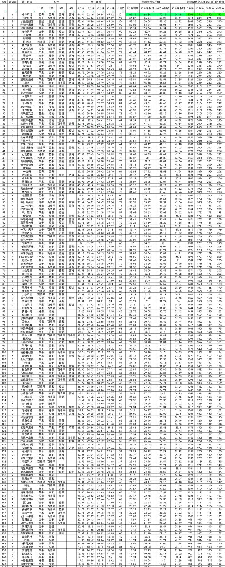 本人熬夜整理,走过路过请点个赞。1️⃣果汁配方果汁总共166种,其中两果配方26种,三果配方63种,四果配方77种,其他配方目前都是拉肚子的。2️⃣果汁成本:图三我先计算出每个果子的成本,果汁成本就是每个果子相加,然后售价减去果汁成本就是利润。3️⃣两果配方:图四利润是高到低是从上往下排列,后面的图都是一样的排列。利润最高的是【一口梅】,许愿树饮品小摊每天可以出售50个果汁,使用5分