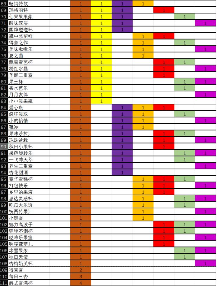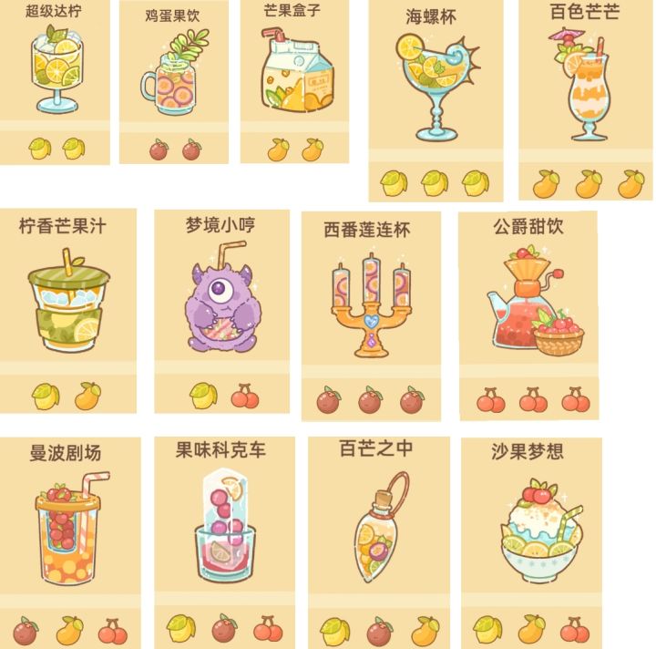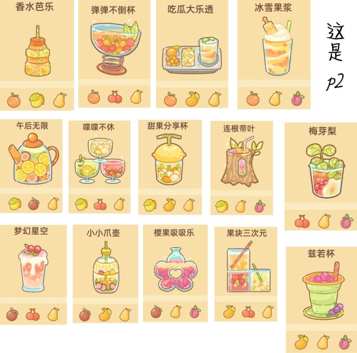 8种水果,共178种组合,目前有166种配方。(有12个黑色是窜稀组合,可能日后会更新?)附游戏内图鉴,不知道还差哪个的鼠鼠可以对照着找找看ID: 10376,有问题请指正萌新不喜欢看表格的可以看这个↓↓↓果汁配方一图流 - TapTaphttps://www.taptap.cn/moment/552887597169377775?share_id=b4b