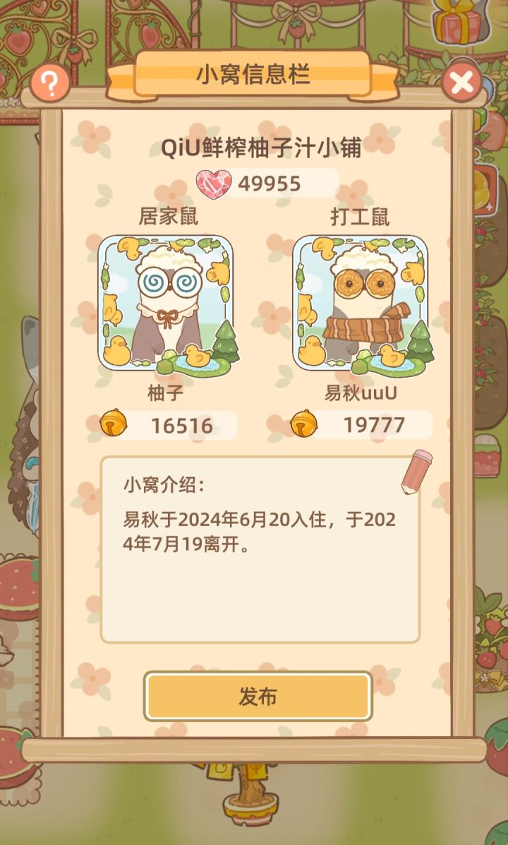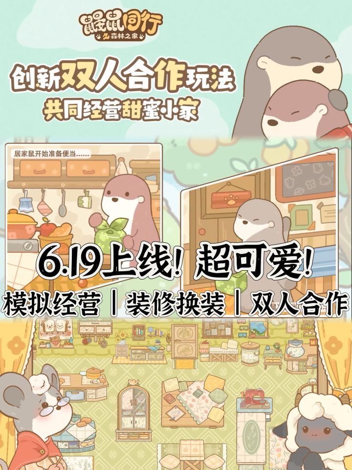 ✅游戏名:《鼹鼠同行之森林之家》.✅平台:iOS|安卓.✅关键词:轻松休闲|模拟经.营|双人合作|装修换装.🪵这是一款以森林动物为主题的治.愈系双人合作经.营游戏,将于6月19日上线公测!快喊你的队友一起玩吧~🤣.🪵玩家将自由选择扮演居家鼹鼠或打工鼹鼠,完成不同的分工。.👉🏻【居家鼹鼠】负责烹饪、采买和纺织等“家务”,也可以通过卖自己制作的花束、便当等赚取松果哟!👉🏻【打工