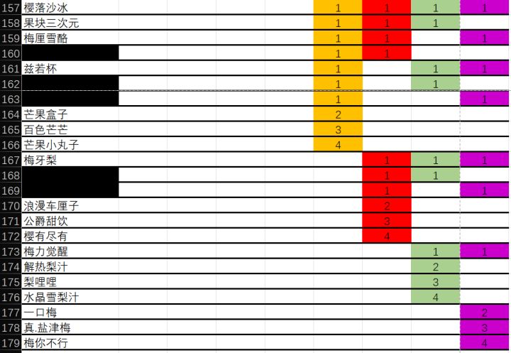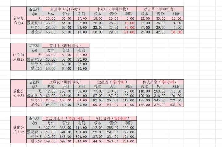 下图包含所有两个果子的配方和三个果子的配方(只含3个重复果和3个不重复果)。 以下六张图是以施第二快的肥为基准(施别的肥都没这么划得来),同时以开三块地为前提的数据计算。第一个利润是一瓶果汁售价的利润,第二个30分钟利润是以三块地30分钟种两茬,两个果子两茬出9瓶,三个果子两茬出6瓶为基础。 前面两张图是两个果子的配方和利润。后面四张图是三个果子的利润和配方。 总结数据,利润前三排序:一口梅