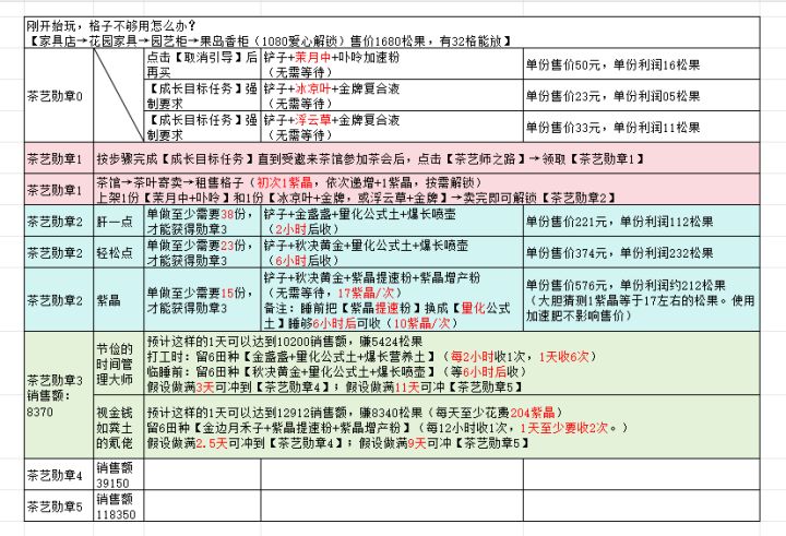 💪(◎൧◎💪)打工鼠们快“吱”愣起来!个人推荐【金盏盏+爆长+量化】每两小时后收茶,往往这时间点,茶馆都能卖完上一波的茶,再补上架。有错就改,会道歉但不赔礼~24.7.2更新内容:①简化图三;②新增图四,将需要紫晶、黄晶的茶种单拎出来作对比,并把所需的松果和紫晶数量列明;③更改紫晶和松果之间的比例,取兑松果的平均值,仅供对比参考