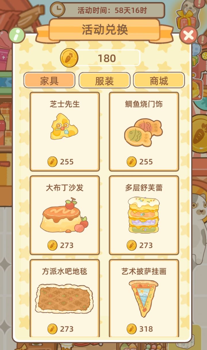 目前只兑换了部分家具,给大家参考一下。有已经兑换的宝子也可以发出来让大家参考一下有没有必要换(有的图是拜访别人家看到的)p1奶油脆皮墙纸和软华夫格地砖p2单独的奶油脆皮墙纸p3多层舒芙蕾(调味架)p4鲷鱼烧门饰p5芝士先生(时钟)