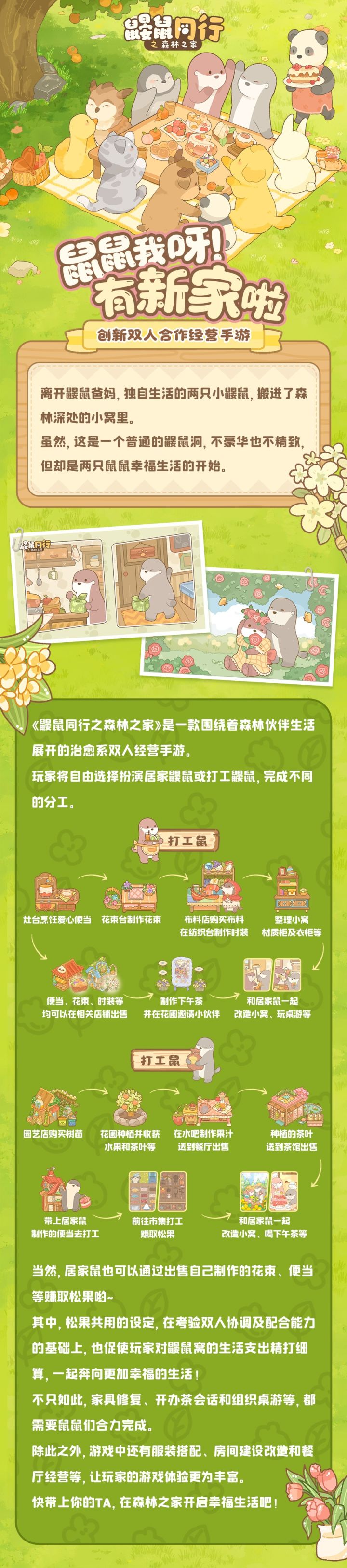 ✅游戏名:《鼹鼠同行之森林之家》.✅平台:iOS|安卓.✅关键词:轻松休闲|模拟经.营|双人合作|装修换装.🪵这是一款以森林动物为主题的治.愈系双人合作经.营游戏,将于6月19日上线公测!快喊你的队友一起玩吧~🤣.🪵玩家将自由选择扮演居家鼹鼠或打工鼹鼠,完成不同的分工。.👉🏻【居家鼹鼠】负责烹饪、采买和纺织等“家务”,也可以通过卖自己制作的花束、便当等赚取松果哟!👉🏻【打工