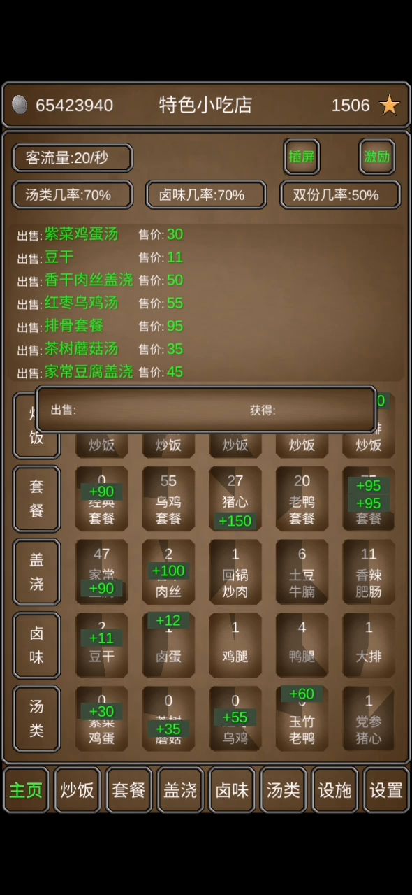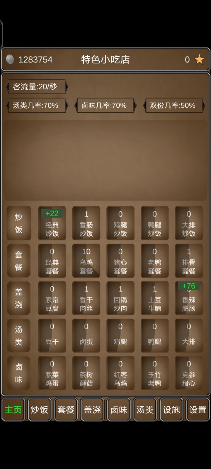 今天中午吃完午饭之后就看到了这个游戏感觉很喜欢,就下下来玩了。前三个食物是单点的,后面的汤和卤味属于佐餐类,随机附带着卖的。每种食物分五个不同的级别,解锁价格好像是500/1000/2000/5000/1W,花10*当前等级可以提升一级库存容量,花费10块钱或者1个星星可以随机升级售价和制作速度。四种设施分别是提高客流量、双倍购物概率和买卤味/汤的概率。我的玩法是:1.最早的时候先攒钱解