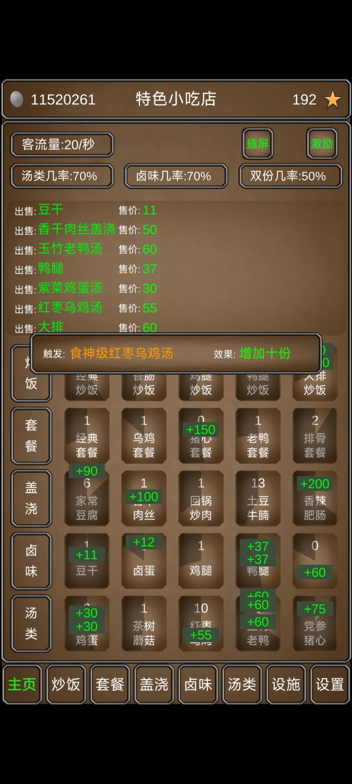 游戏时长在半小时左右。就已经玩透了。 铜币只能把菜品强化到次顶级,只有看广告获取的星星才有概率把菜品强化到顶级 苹果商店下载链接: https://apps.apple.com/app/id1591723908