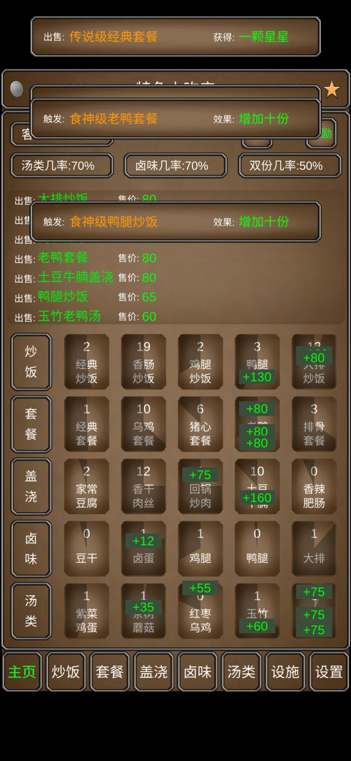 游戏级别配方:普通-稀有-惊世-绝世-传说厨艺:初级-中级-高级-特级-食神注:最后一级只能用星星升,而星星最开始的来源只有广告,除非能用初始送的30个星星点到传说,之后靠挂机攒星星。不过这游戏不能离线挂机,你还得一直在线,同样是浪费生命,还是看广告浪费的少点,还能支持一下独立制作人。游戏进程解锁完一个菜谱之后随便升一下配方,点个10来下,运气好能直接到绝世,厨艺不用管。升级可以用银
