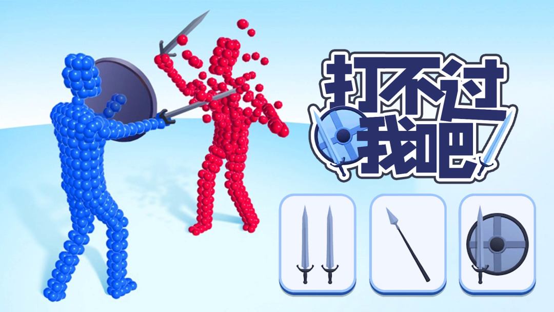 打不过我吧是一款有趣的益智休闲小游戏!玩家在游戏中控制一个小人,通过点击按钮选择武器,通过拖动来改变小人的姿势。点击进攻后,小人会拿着武器用摆好的姿势与对方决斗,武器越早碰到对方的一方获得游戏的胜利! 游戏中多种不同的武器,奇形怪状的地图机关,有不同姿势与武器的对手让游戏充满了随机性与乐趣!
