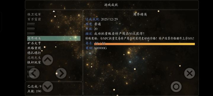 #神律跑商 成就三个成就可以考虑特雷西亚,购买西芹或者可可菇来回庞拜倒卖,因为马车传送快(也方便我们记性差的兄弟去雕像那里查看成就进度)记住如何快速刷满!!这个是关键,跑商150和商业是50次就行了,这两个其实就一个前后,大家每次买满数量,每个商行一次只卖100个,买够以后就开始枯燥的刷次数了,记住批量!这个词,5个就算一次,那相当于100个商品你把多余的放仓库用魔法纳戒,(没有纳戒的兄弟可以先去