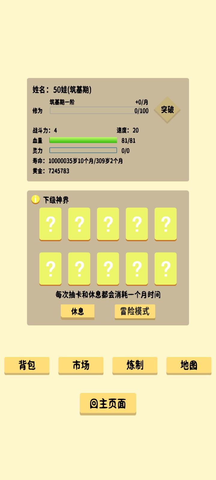 给大家来个攻略吧。1.进去就直接看广告把速度加到100+.2.然后开始游戏,看4个广告得到4w黄金。3.花点寿命去下一个图。4.市场买炼器材料1w一个的,买4个。5.疯狂炼器,卖武器。存10w到第三个图。6.市场买最高级灵石,然后开始提升境界。7.以此类推后面的图都这个模式。很快就能到神界了😘