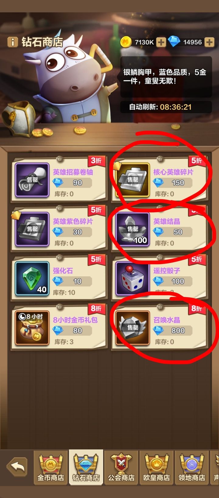 不氪金的话,钻石的获取还是有限,所以不要乱花钻石,每天商店买召唤水晶,英雄结晶和核心英雄碎片就行。◤见图二◥