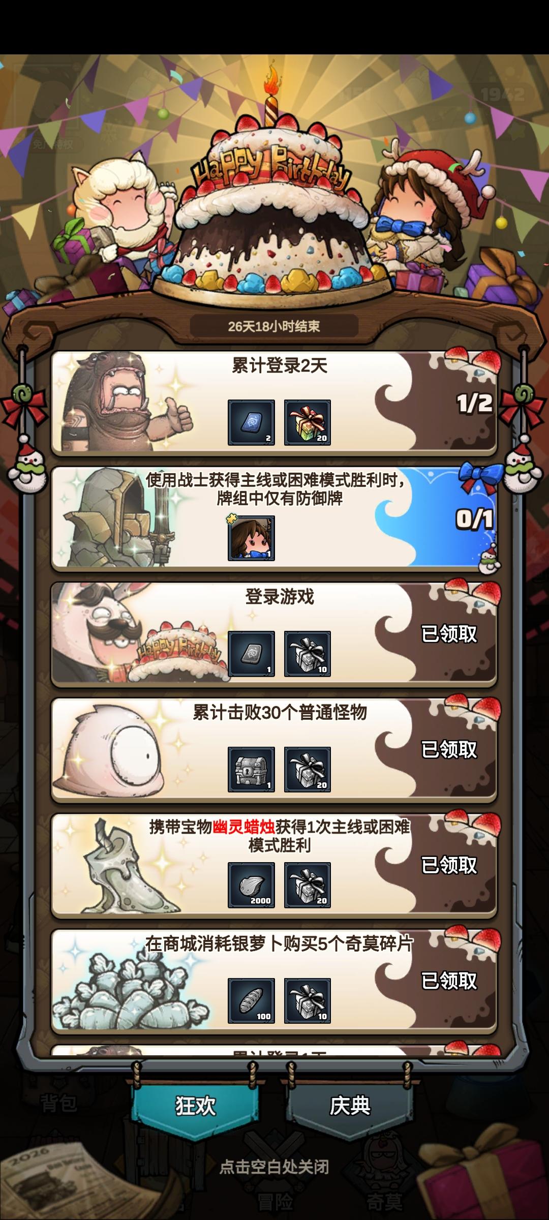 本次更新已结束,感谢大家的耐心等待。“你们,才是我的乌托邦。”本次更新新增周年庆活动,优化核心资源产出,以此感恩我们在一起的每一天。更新结束后,将会跳转TapTap下载最新包体,开始新版本体验。本次更新内容如下:新增内容➢新增种族1.新增白圣诞奇莫以及相关成就;2.更新结束后,每日有几率在深渊楼梯中刷新白圣诞奇莫;3.12月23日0点,圣诞神圣宝箱将替换商城中的黑暗宝箱;4.白圣