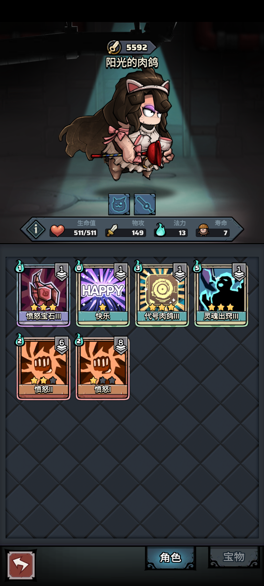 选猫头晕挂灵魂出窍来刷金币,基本上第一层就能刷到2000。手办可以拿普通手办,不用手办也行。宝物可以刷一个初始的辣椒,没有辣椒打得慢一点。另外有几个小细节1.任务不急着做,可以留到后面一起做,而且不是所有任务都必须完成。2.尖塔也可以完成任务。3.旅馆可以先尽可能都招募进来,等后面再慢慢删。#代号肉鸽