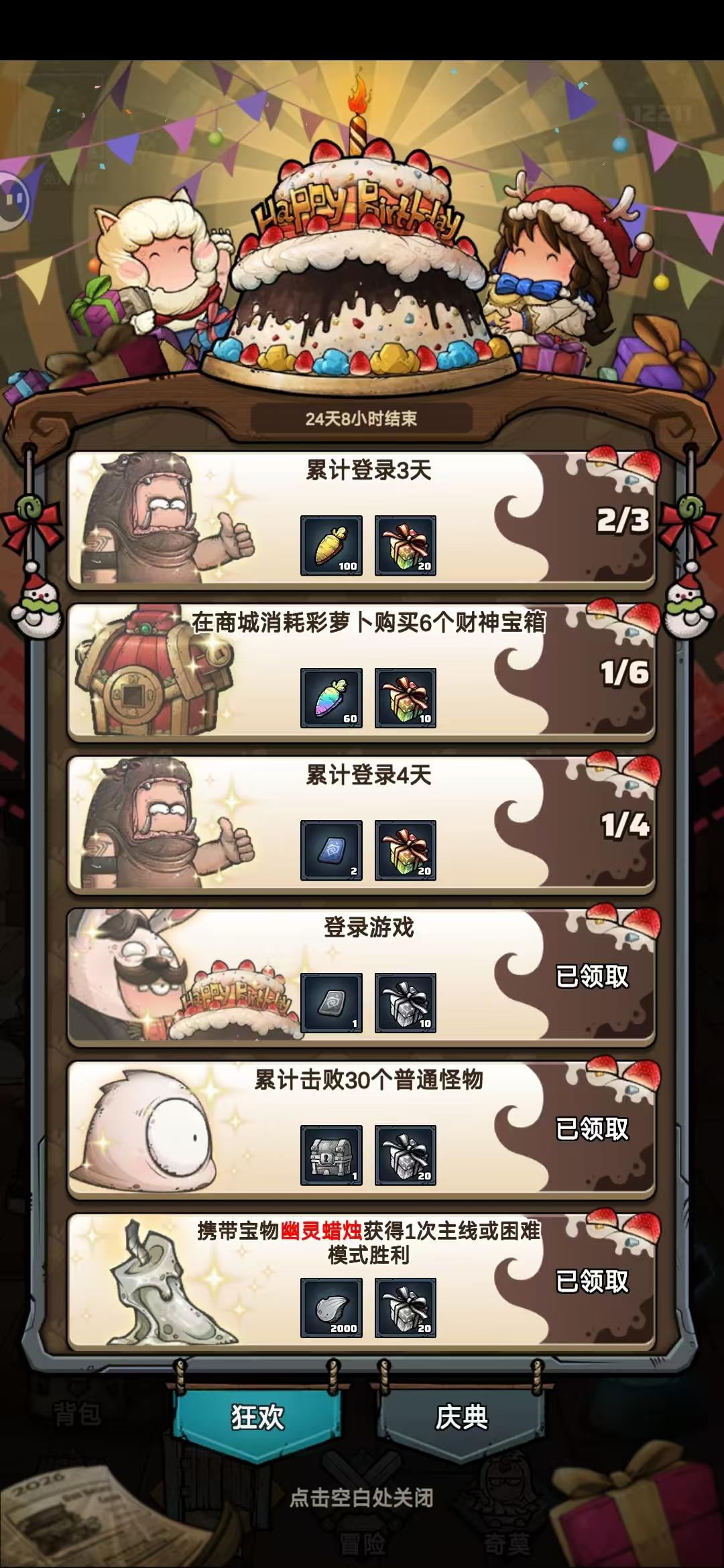 欢乐时光的天赋真的是看运气,跑了三次才刷到。爬到第五层,没有任务就可以退出重开了,愤怒也是,但是要管住手,别合并了。目前来看,任务都还挺好过。后面会不会出深渊集六色鸭圈?10个矮人王大冒险?或者让我们带满食物闯深渊?毕竟游戏里食物的宝物那么多希望新年也有这样的活动,每天等待未知的新任务。