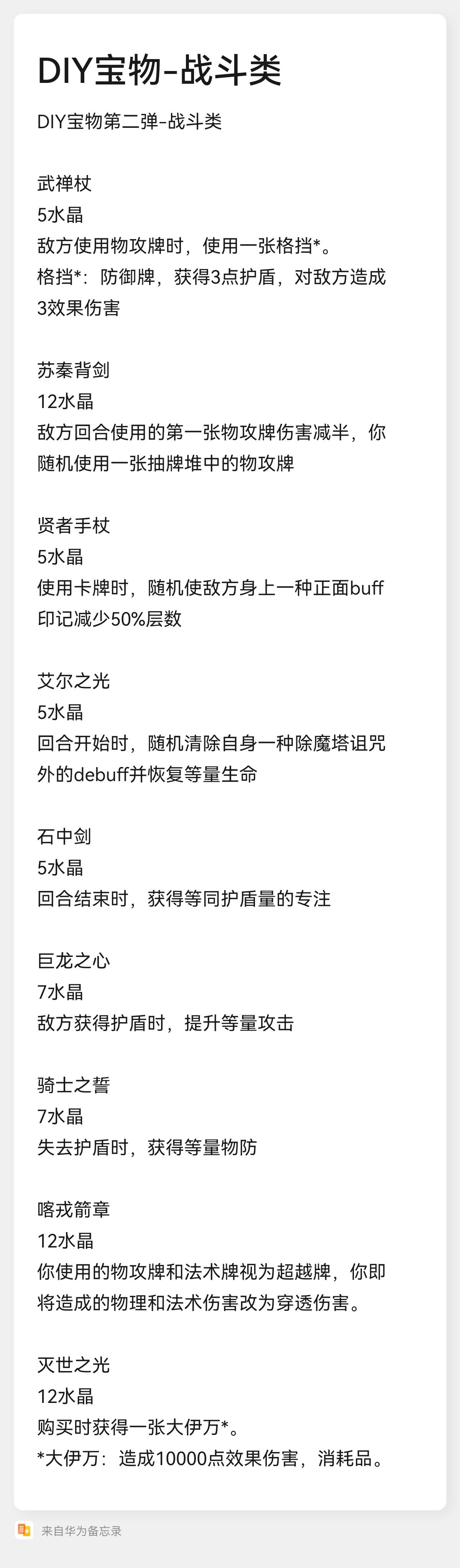 武禅杖5水晶敌方使用物攻牌时,使用一张格挡*。格挡*:防御牌,获得3点护盾,对敌方造成3效果伤害苏秦背剑12水晶敌方回合使用的第一张物攻牌伤害减半,你随机使用一张抽牌堆中的物攻牌贤者手杖5水晶使用卡牌时,随机使敌方身上一种正面buff印记减少50%层数艾尔之光5水晶回合开始时,随机清除自身一种除魔塔诅咒外的debuff并恢复等量生命石中剑5水晶回合结束时,获得等同护盾