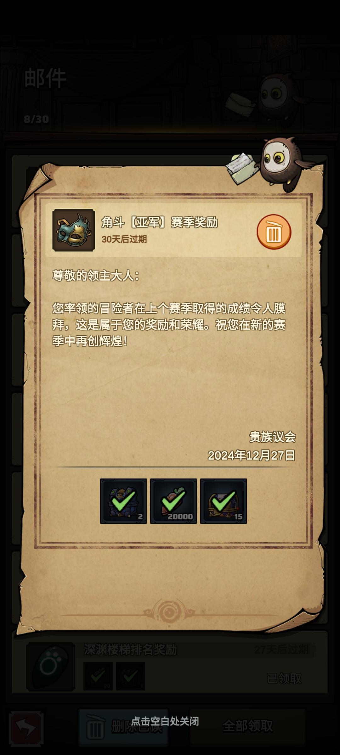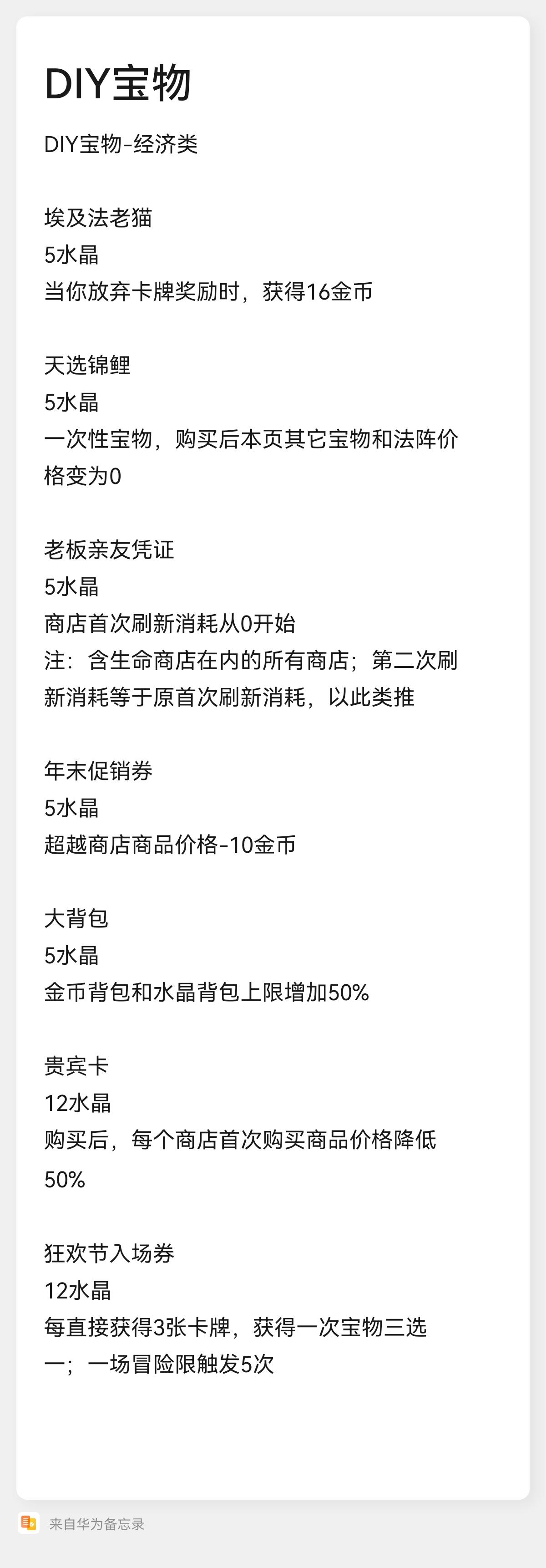 埃及法老猫5水晶当你放弃卡牌奖励时,获得16金币天选锦鲤5水晶一次性宝物,购买后本页其它宝物和法阵价格变为0老板亲友凭证5水晶商店首次刷新消耗从0开始注:含生命商店在内的所有商店;第二次刷新消耗等于原首次刷新消耗,以此类推年末促销券5水晶超越商店商品价格-10金币大背包5水晶金币背包和水晶背包上限增加50%贵宾卡12水晶购买后,每个商店首次购买商品价格降低50%