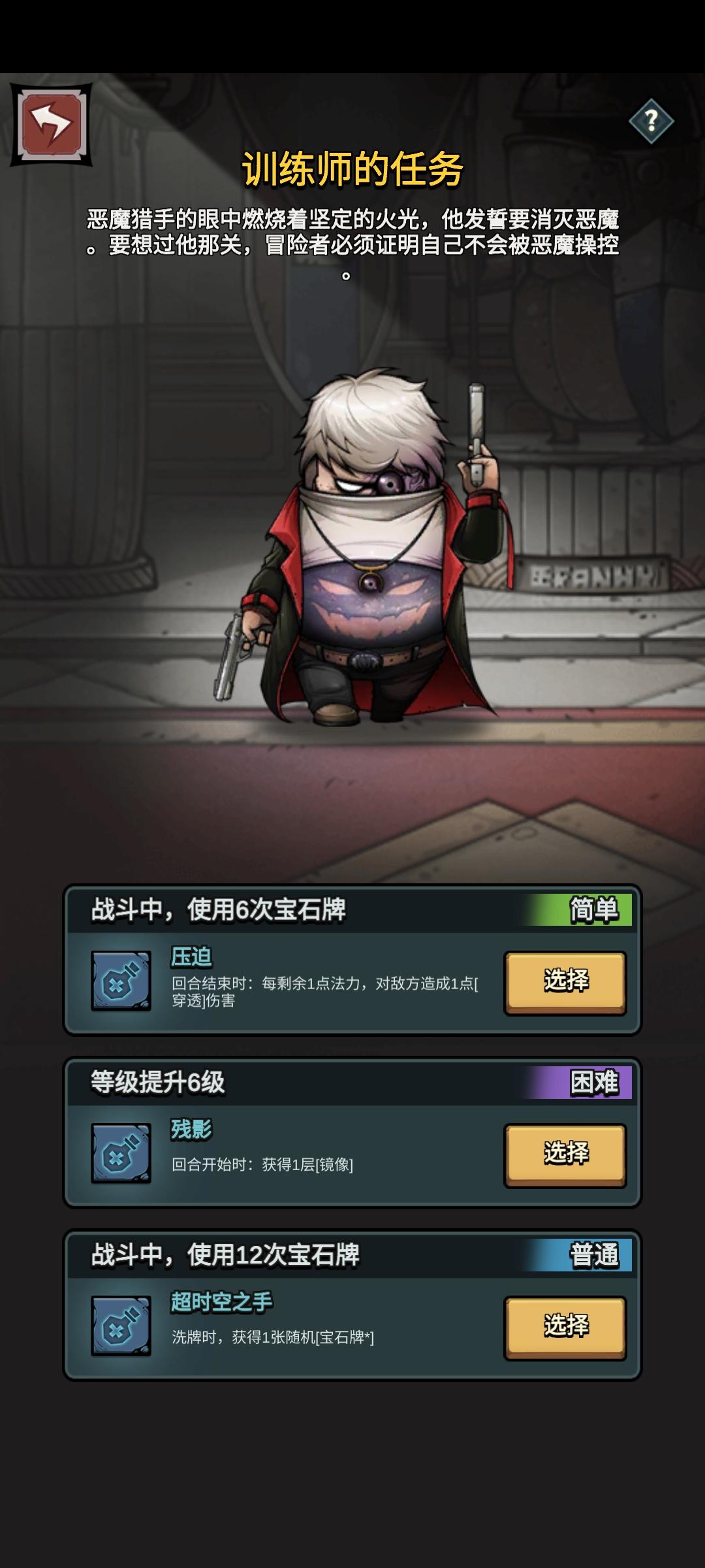 法师比较简单,火法,宝物火焰草莓,卡牌:冷风,过度解冻,火焰打击,回忆,快速思考。任务没要求。战士,任务天赋啤酒肚,宝物骑士石像,魔塔石像,卡牌:无限宝石,发现弱点,盾击。猎人,任务天赋欢乐时光加金币子弹,宝物沙漏⏳,卡牌两张近身准备,终极射击,瞄准,强攻宝石,炸裂宝石。旅行者没有好的思路,我只会一个炸弹机,实验眼镜加实验手套,一顿扔炸弹。小怪注意一下亡灵契约,和嘲讽盾击,121准备个驱散