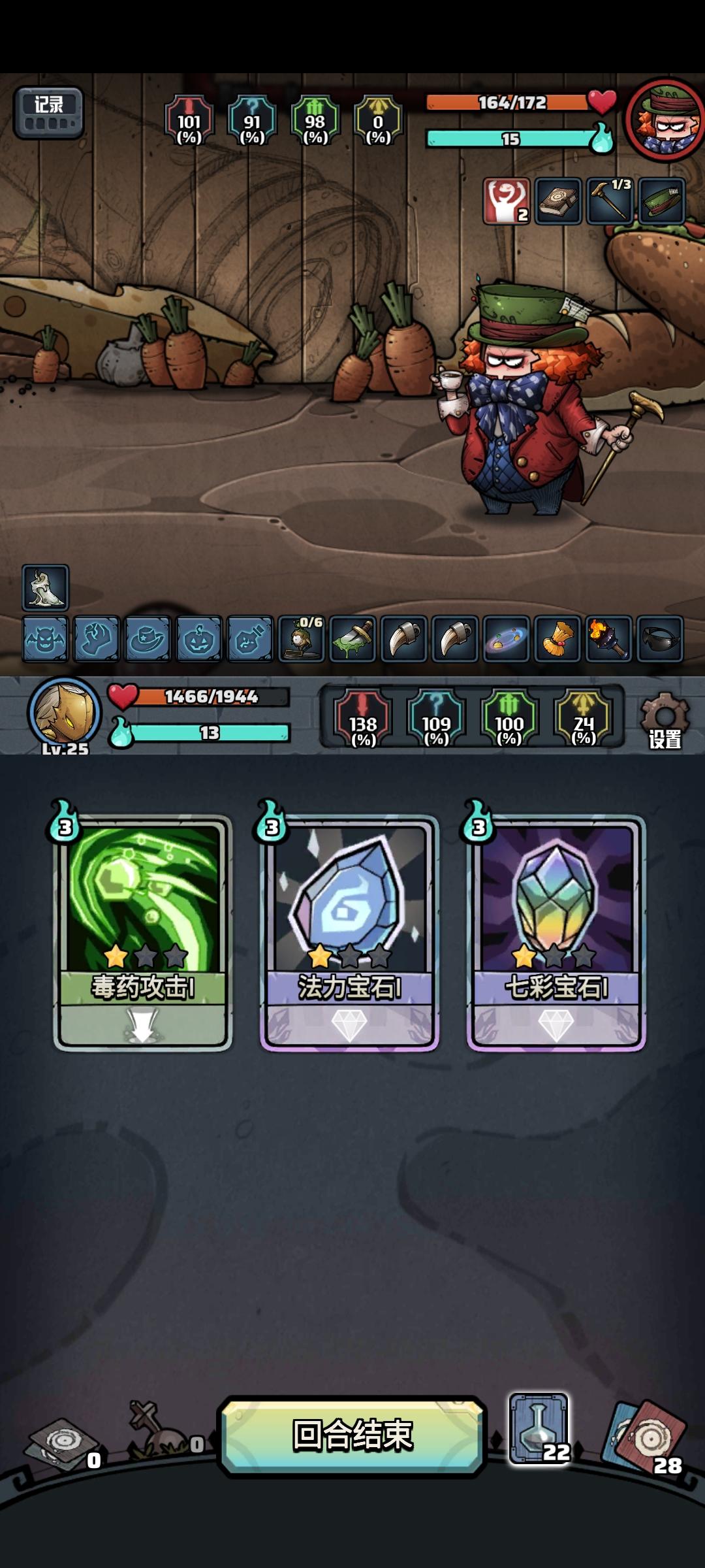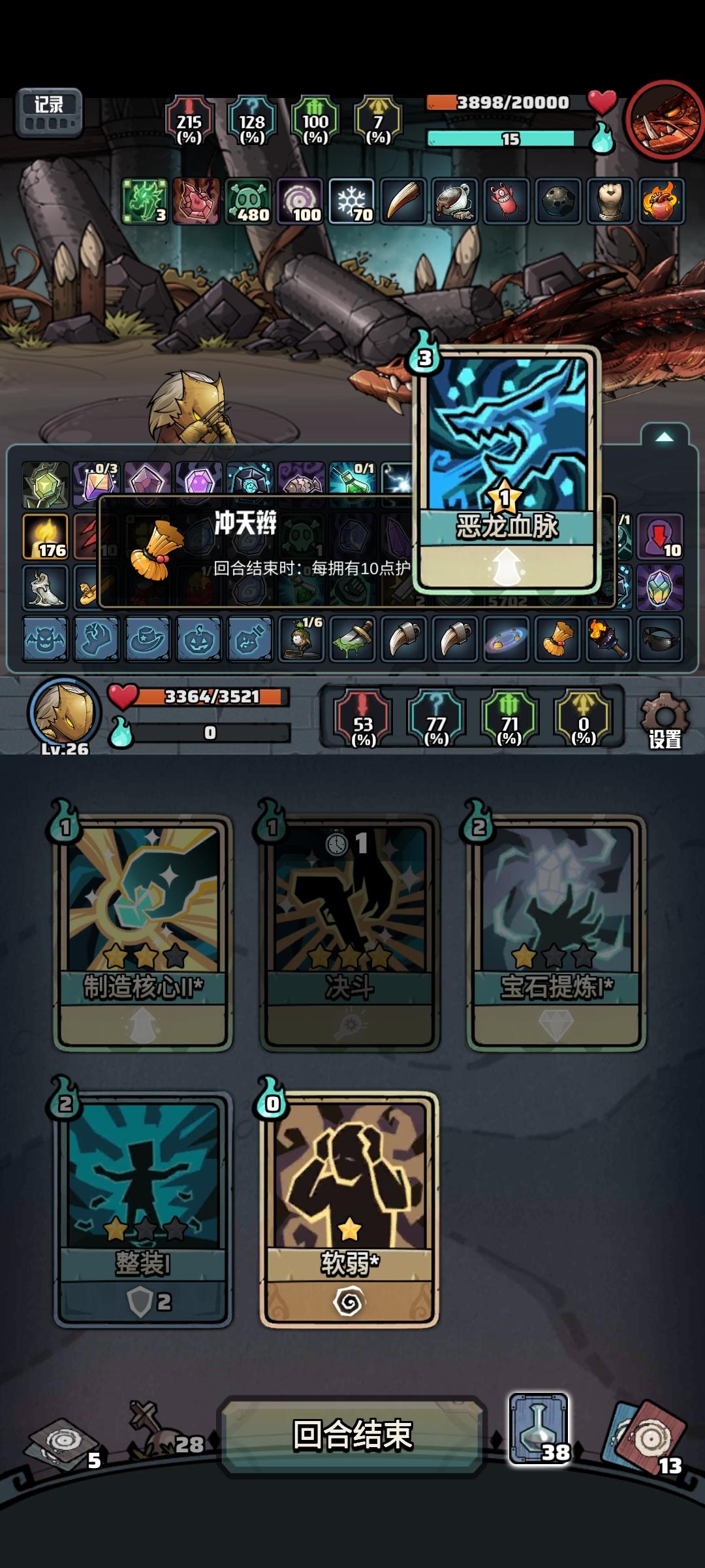 刚开局就吸得只剩一百多了,这下谁分得清你是小怪还是BOSS实验眼罩开魔术镜,夺笋+宇宙,镜像后又复制各两张,考考大家这一共是多少血呀也是养出2000血的奇莫了,卡组速度也是比较慢热(打BOSS也不算慢),核心是靠任务给的中毒不衰退和用卡牌把中毒转化成祈愿来打后期输出,两个毒盾宝石后期叠到9999满盾,然后冲天辫是个相性极好的宝物,前期一直掉血后期再把血量拉回来