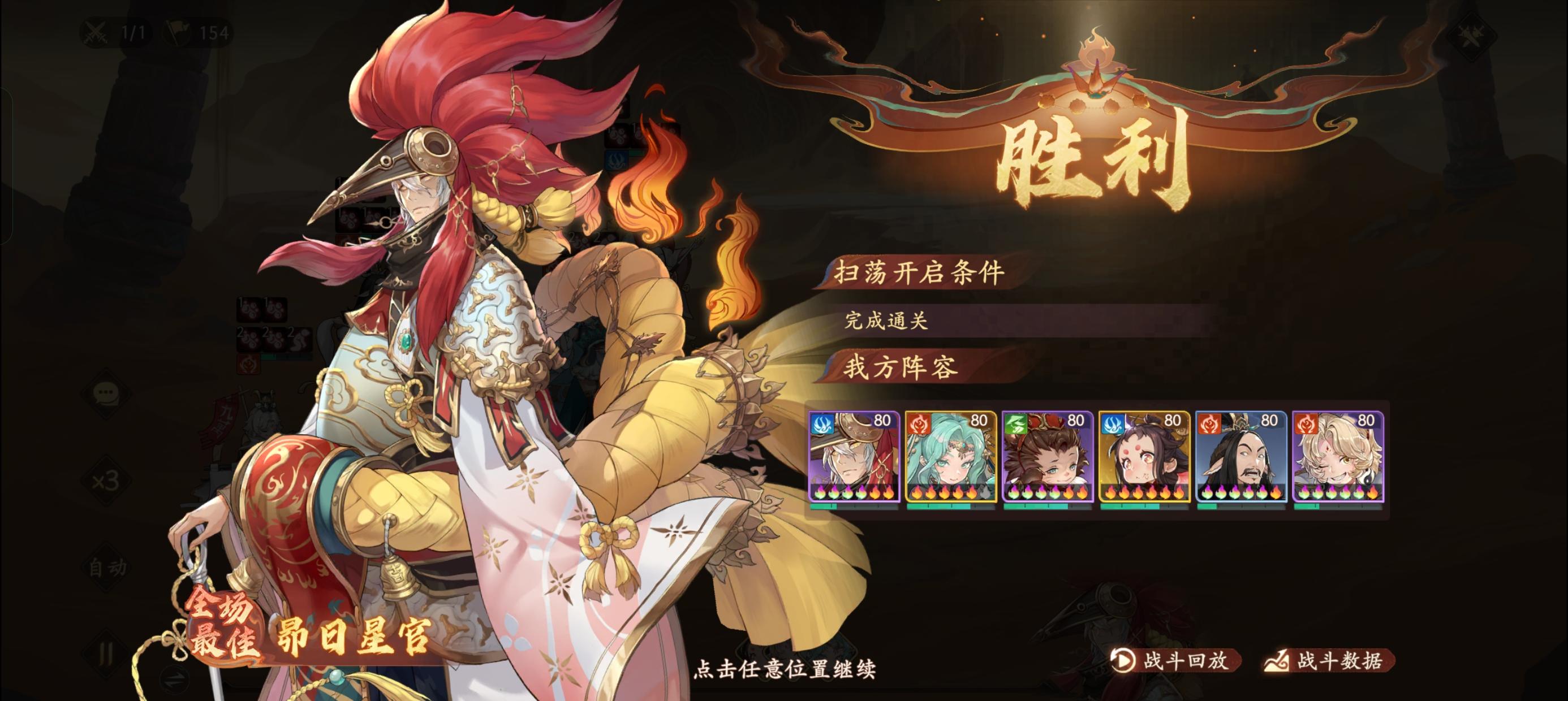 李天王一,二速开大,防一波灼烧,顺便识破减boss输出。小旋风,敲完铜锣,哪吒摔buff戳,加猴子暴击完连击红孩儿只剩一丝血,然后阎罗有大开大,抗抗扇子。接着闭着眼睛平a丝血红孩儿,几下就过了。没啥难度。反而是200前面的关卡比较难。这一关,我体验下来是最简单的。