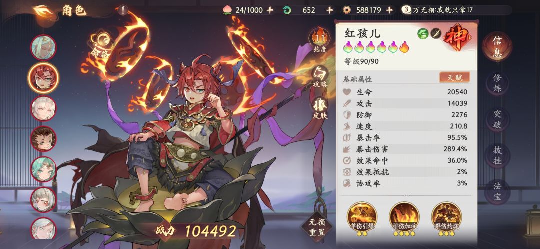 从头到尾没换过人,一直是这六个平推到105,之前看我攻略的朋友应该也感受到这套阵容的威力了[表情_开心] 这套根本不需要大氪,氪个几百就能玩的很好,楼主红孩儿、孔雀、九头鸟都是6星,哪吒彩1,嫦娥5星,平民或微氪可以无脑抄 补充一下高难关卡的技巧,这种关卡一般是前排三个坦克贼肉,后排三个输出伤害很高,这种关不可能速战速决,必须先造成对方减员,再慢慢磨死对面。 打法是九头鸟破防,嫦娥加攻,哪吒加暴击