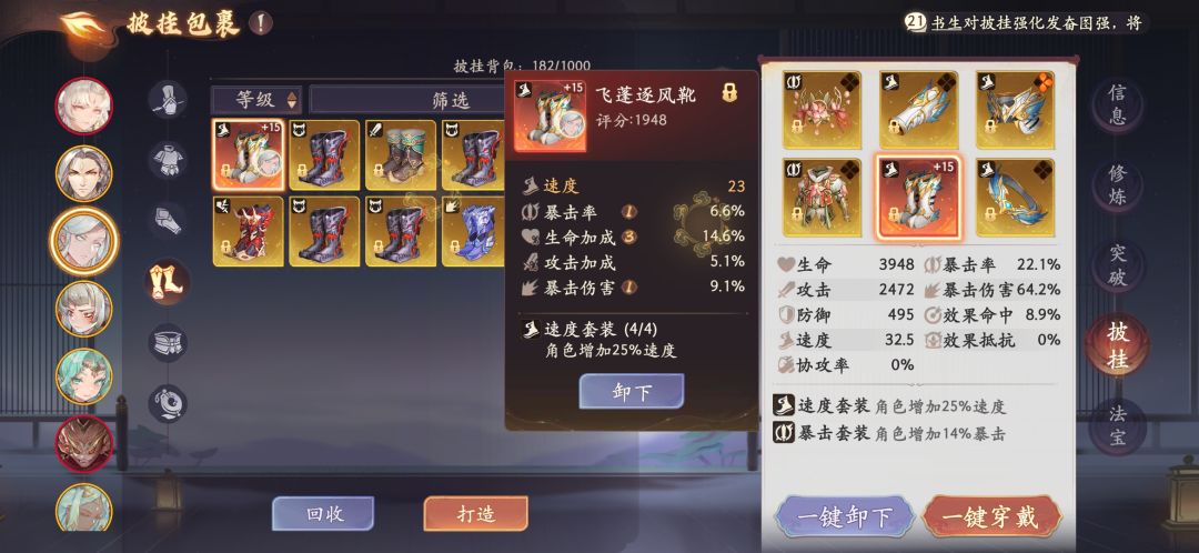 首先来说点暴论,披挂刷取我个人只推荐黄沙,缺两件 套的随便刷刷就好,主要还是刷黄沙(前期还是第一个 好,好成型),黄沙提供的速度套是最关键的,另外两 个也很重要对于某些角色是质的提升但这两件要求的装 备分比较高, 然后是装备打造,常规打造只打头盔,护臂,盔甲,因 为这三个部位的主属性是固定的,福源打造就打另外三 件鞋子除反击套和生命套(大部分也是打速度的,看个 人需求)一律打速度主属性,另外两个部