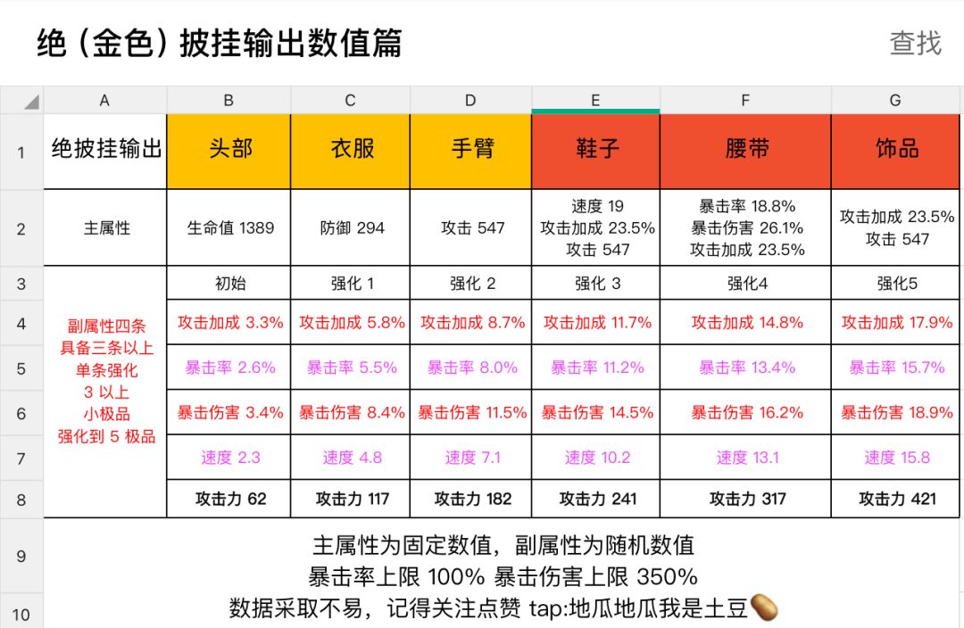 副属性初始基础数值,强化 1~强化 5 基础数值 数值随机机制,有的大有的小, 可以对比我图中参考。 主属性与副属性同种词条不能同时存在(商店卖的除外,我是真没见有人能打造出来的) 副属性初始四条才有概率强化5 暴击率 上限 100% 暴击伤害上限 350% 不定时更新,有什么问题可以评论区留言