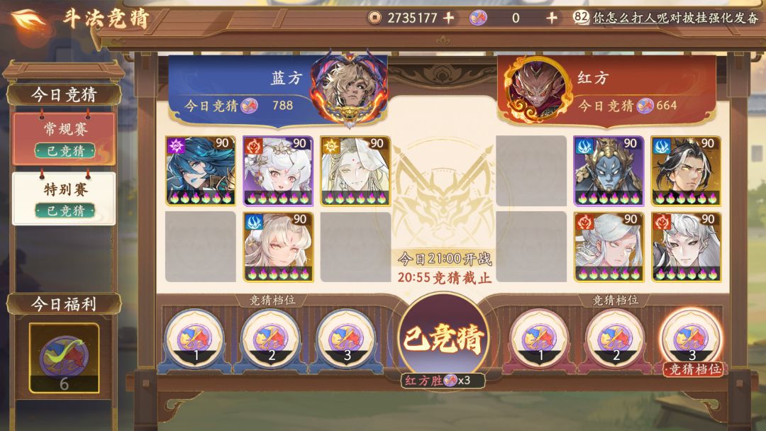 常规赛 蓝方阵容:猪八戒、孙悟空、女儿国王 银角大王、玉兔、孙悟空 红方阵容:女儿国王、长明、长明 孙悟空、万圣公主、唐三藏 阵容简析:蓝方:猪八戒(154速,法宝:玲珑宝塔)、孙悟空(212.5速,法宝:如意金箍棒)、女儿国王(156速,法宝:扶鸾)、银角大王(175速,法宝:九鸧绕月)、玉兔(218.7速,法宝:浓情绣球)、孙悟空(212.5速,法宝:如意金箍棒)红方:女儿国王(156速,法宝