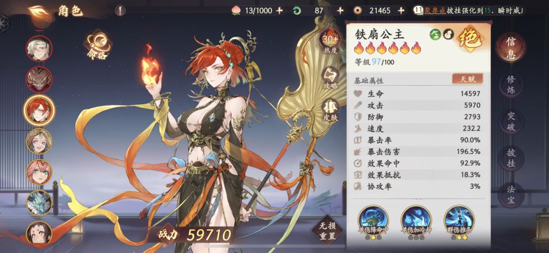 【1.1(下)攻略】铁扇公主攻略 技能介绍: 二技能打技能cd并且自拉回合,配合大招可以起手2+3打出惊人的压制力 大招80%概率群打条20%加十字技能伤害免疫,也有可能不中的情况,但总的控制的稳定的,还多一重保险措施。 升星解锁: 大招3彩开十字加攻 2技能5彩不存在同列后排敌人伤害提高100% 命格技能优先: 行动值降低20%〉2技能减冷却〉2技能加伤害 披挂推荐:速度暴击套