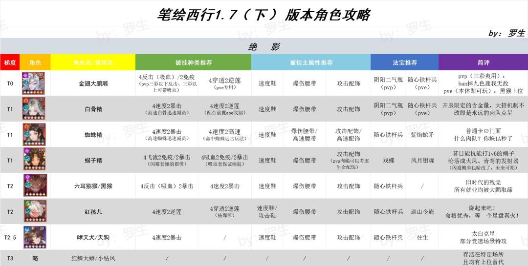 首先,白骨精的定位是主C输出 在 PVP 培养等级: TO 在 PVE 培养等级: TO 白骨精属于当前版本最强输出角色,不管是 PVP 还是 PVE 都有很亮眼的表现,在 PVP 不管是速度队还是肉队都有发挥空间 星级: 五火:攻击+10% 一彩:额外有90%概率附加1层撕裂效果 二彩:防御+10% 三彩:攻击前自身获得2回合攻击提高 四彩:生命+10% 五彩:有90%概率对目标附加禁疗,持