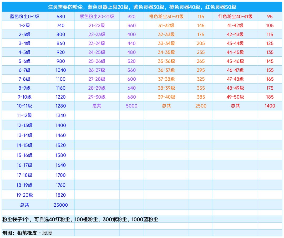 新系统灵器,各个等级注灵所需粉尘资源!