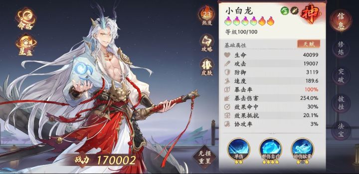 这个角色,怎么说呢,挺弱的,为此我还和不少人争执过,但弱就是弱,没什么好说的,我开服就在玩,一开始三彩在玩,为什么现在还没五彩?因为我觉得5彩救不了小白龙,所以没有去抽也没有用自选,现在还缺一个上5彩,这个角色很尴尬,你游唯一一个所有属性都要的角色,伤害跟生命和攻击挂钩可暴击,技能效果需要命中,反击需要挨打,挨打怕控需要抵抗,怕被秒需要防御,开大需要速度不然抗暴就等于没有,现在就等星盘技能和专武